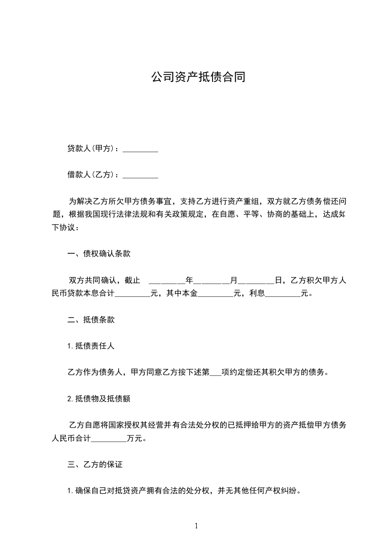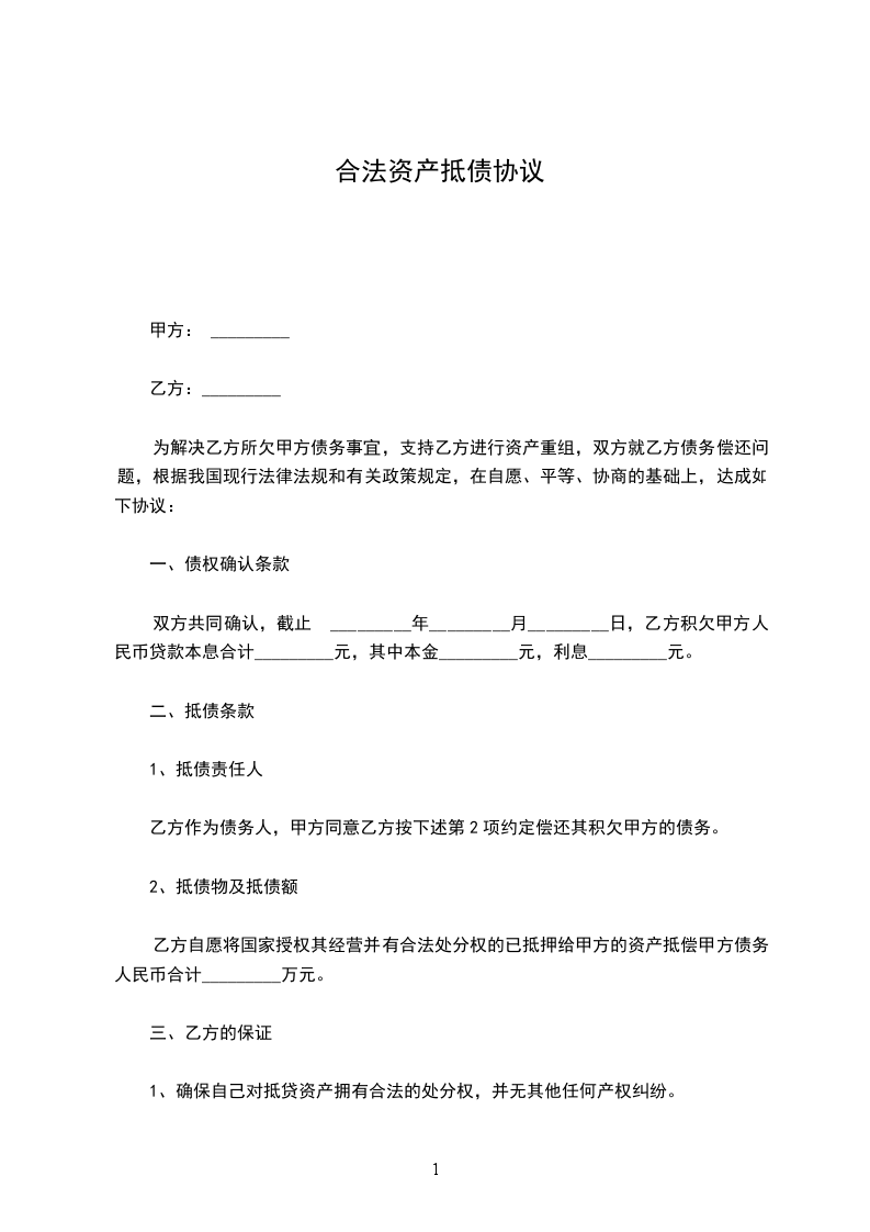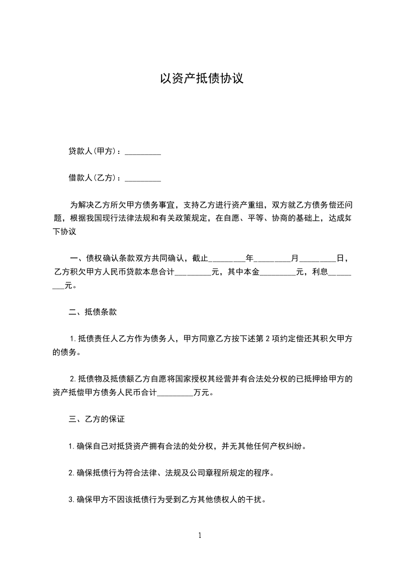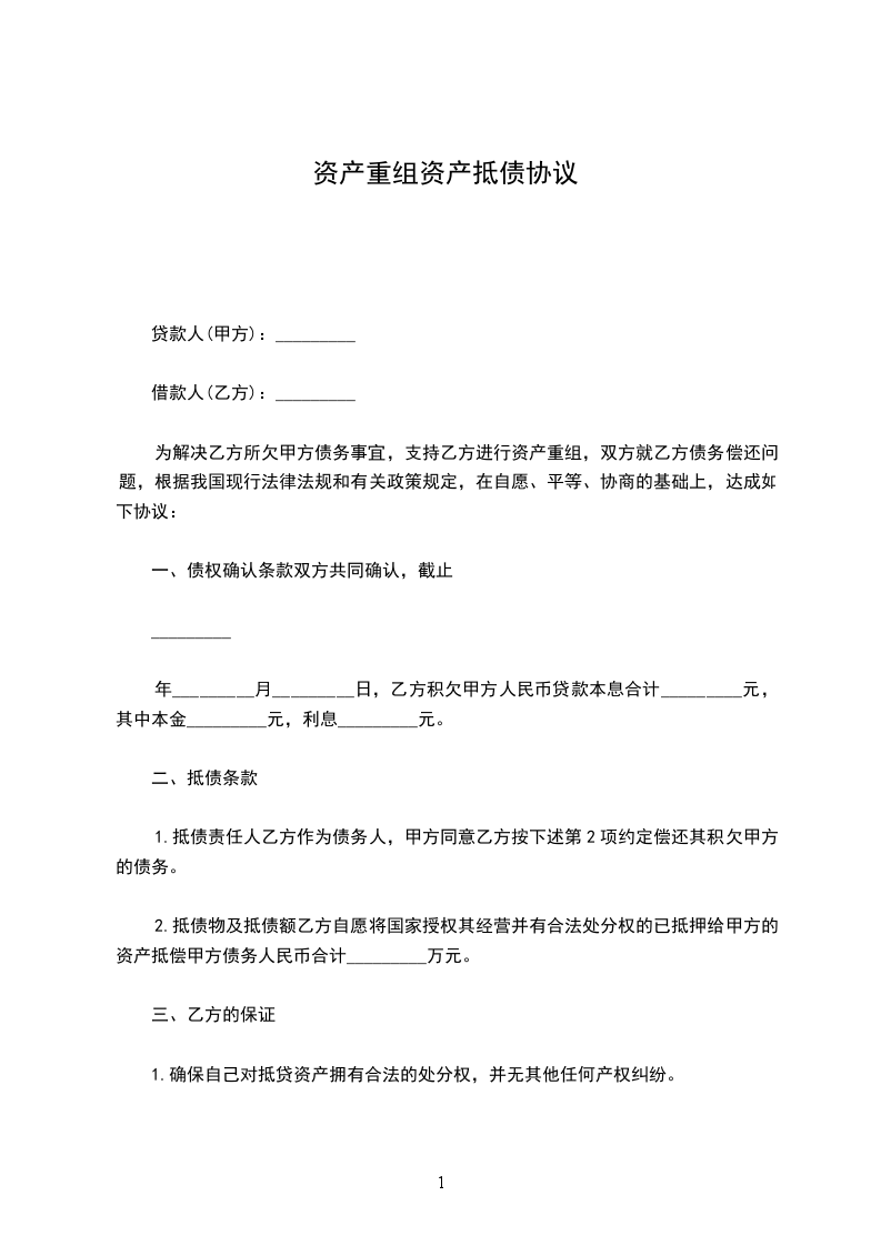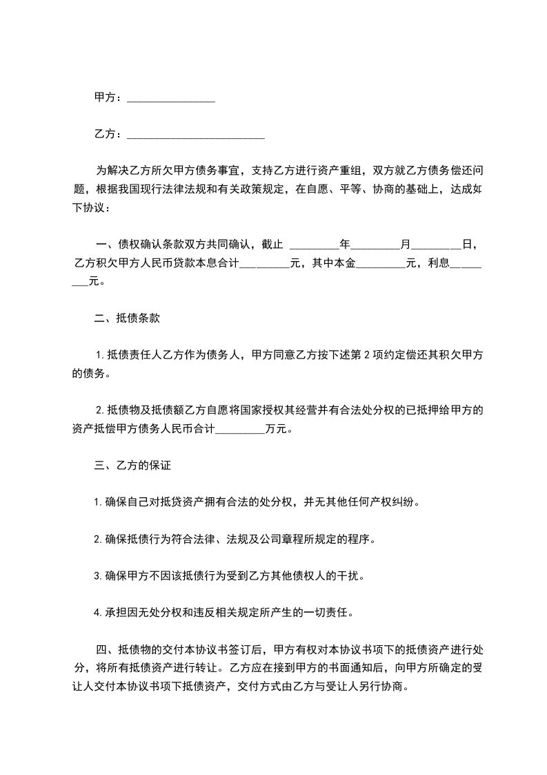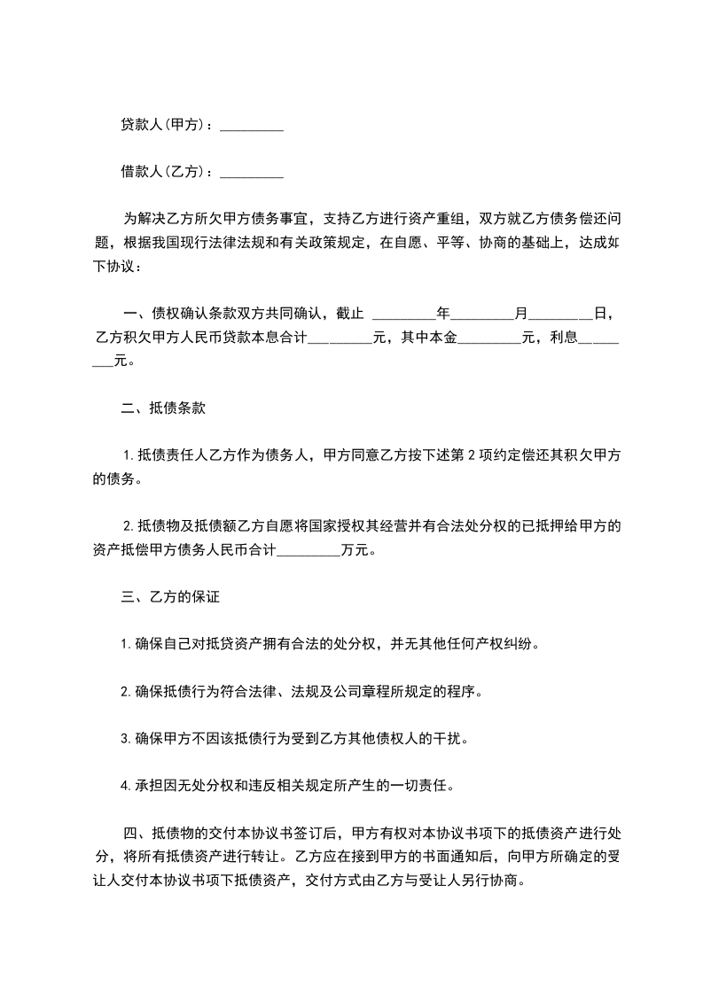 借款人(乙方):_________ 为解决乙方所欠甲方债务事宜,支持乙方进行资产重组,双方就乙方债务偿还问题,根据我国现行法律法规和有关政策规定,在自愿、平等、协商的基础上,达成如下协议: