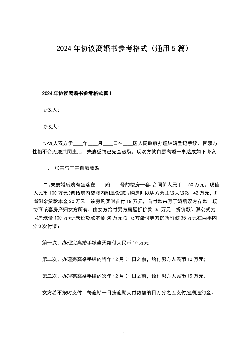 (2)得到产权的一方自愿补偿放弃产权一方____万元,在签订协议当天补偿放弃产权的一方____万元,办理离婚登记当天支付_____万元,剩余款项在离婚后____日内支付完毕。