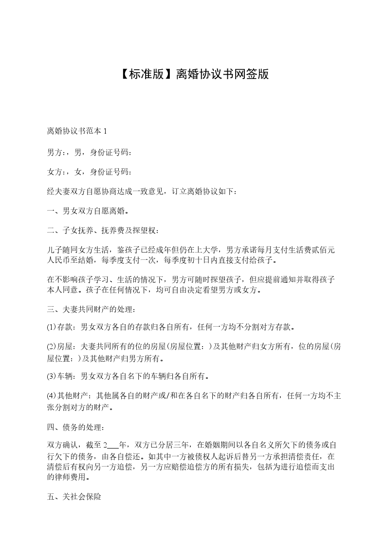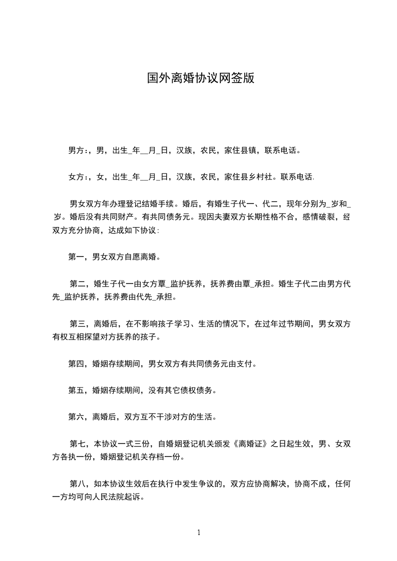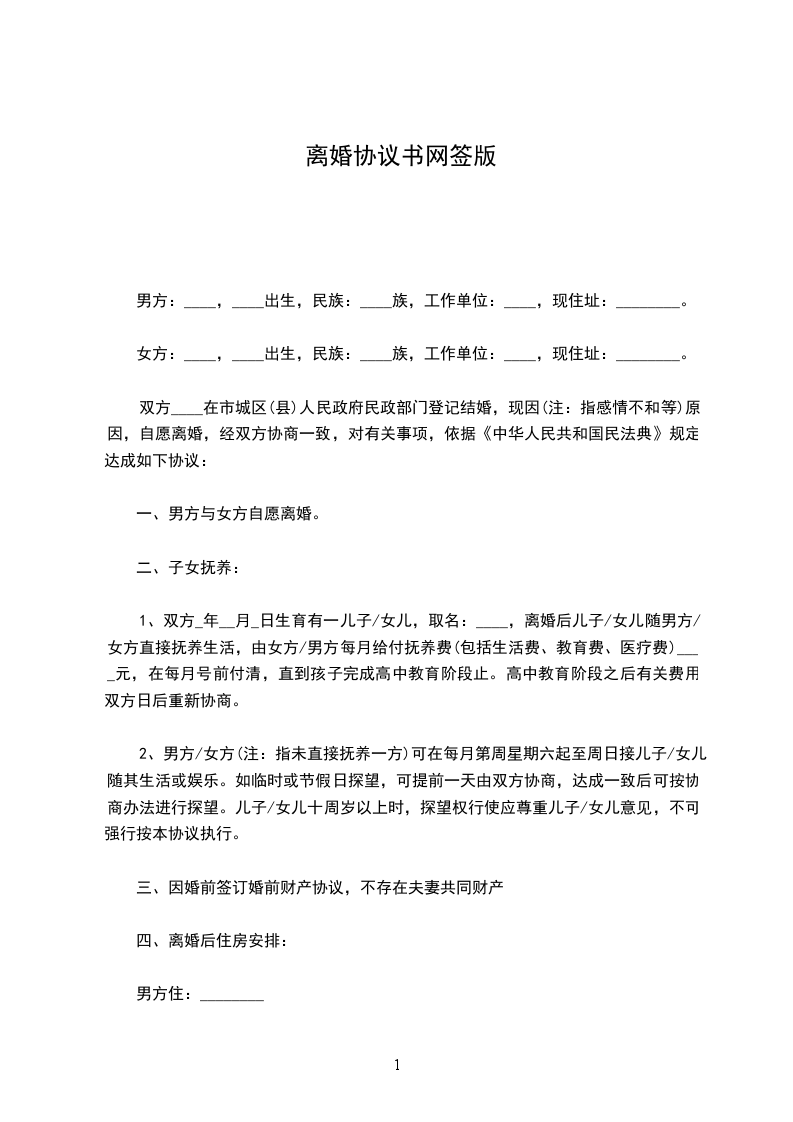 二婚离婚协议书3男方:________,男,汉族,______年______月______日生,住__________,身份证号码:_________________________________