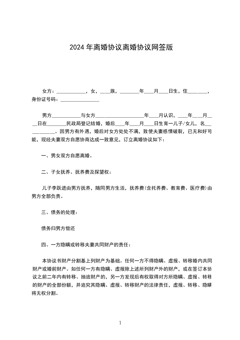 女方:_________,女,汉族,______年_____月______日生,住______________,身份证号码:__________________