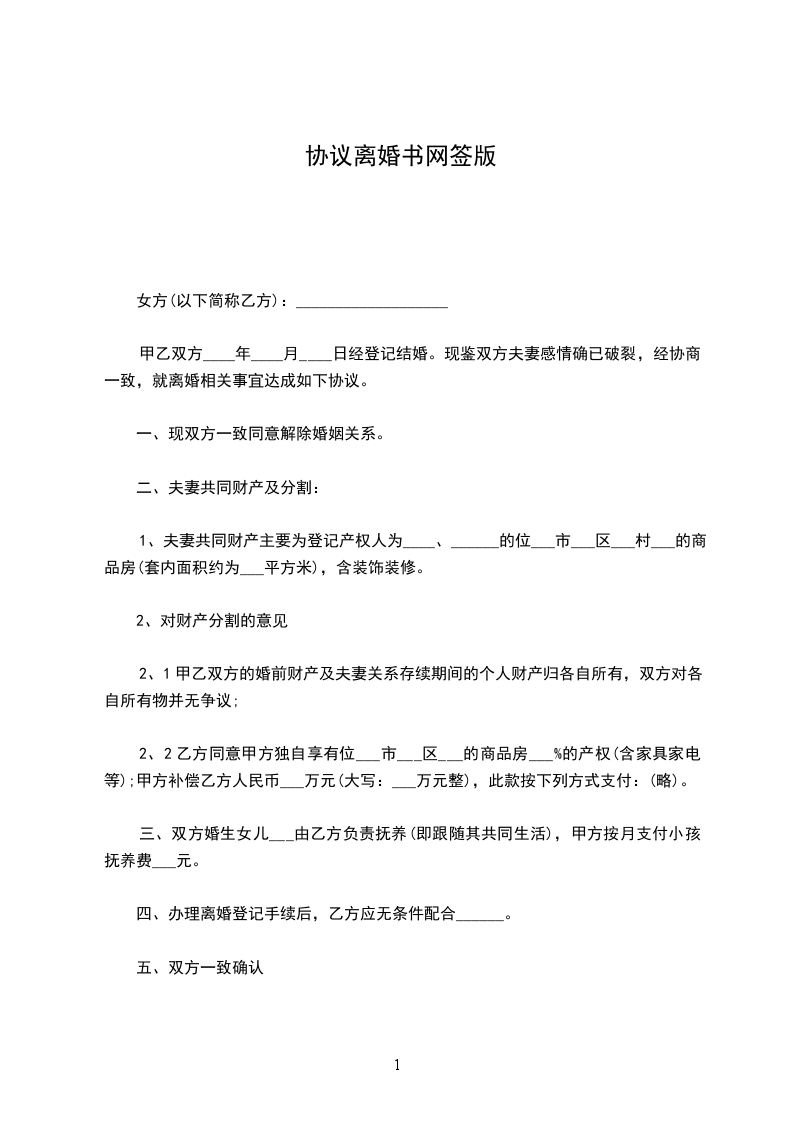 男方与女方_年_月认识,_年__月_日在登记结婚,婚后_年__月_日生育一儿子/女儿,名。因__致使感情破裂,已无和好可能,现经双方自愿协商达成一致意见,订立离婚协议如下: