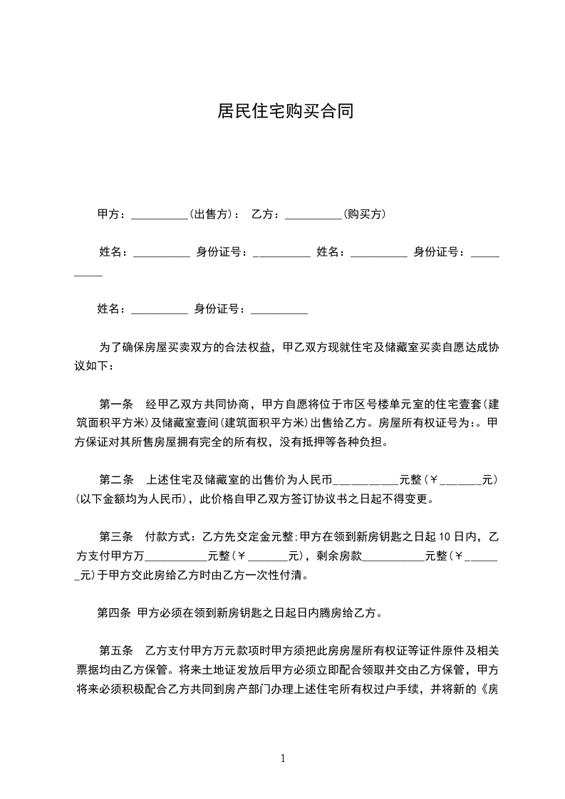 第一条 经甲乙双方共同协商,甲方自愿将位于市区号楼单元室的住宅壹套(建筑面积平方米)及储藏室壹间(建筑面积平方米)出售给乙方。房屋所有权证号为:。甲方保证对其所售房屋拥有完全的所有权,没有抵押等各种负担。