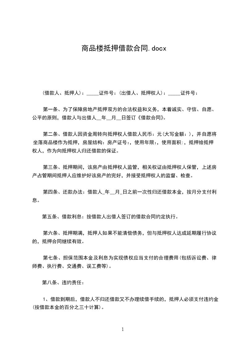 第一条、为了保障房地产抵押双方的合法权益和义务,本着诚实、守信、自愿、公平的原则,借款人与出借人__年__月__日签订《借款合同》。