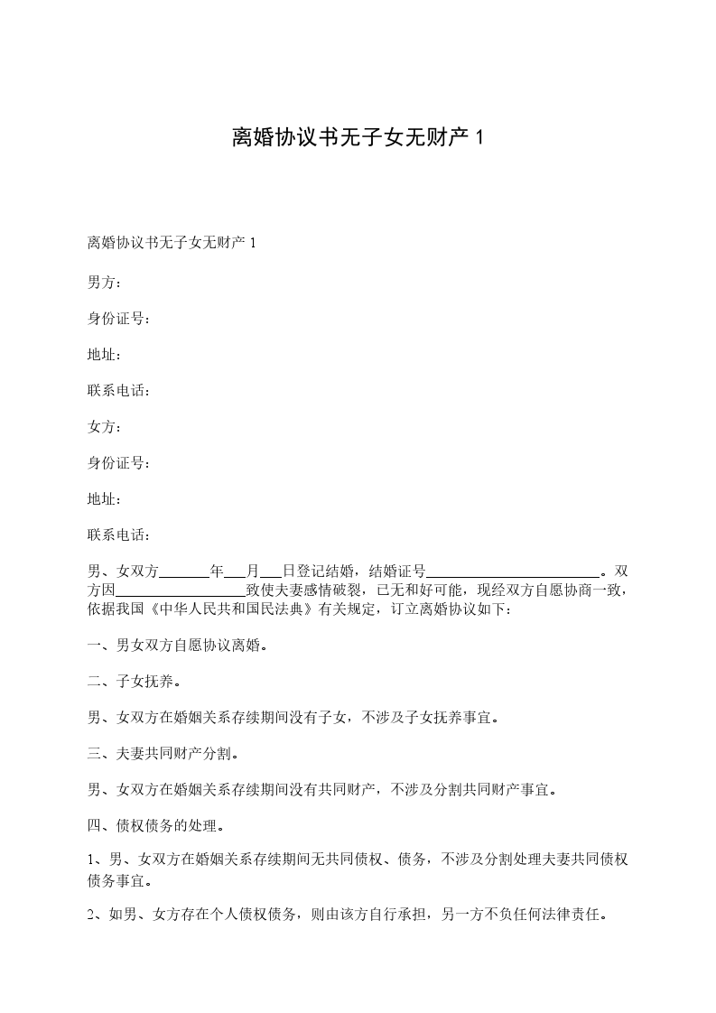 无财产离婚协议书男方:_______________,汉族,生__________年_______月______日,身份证号码:_____________________________