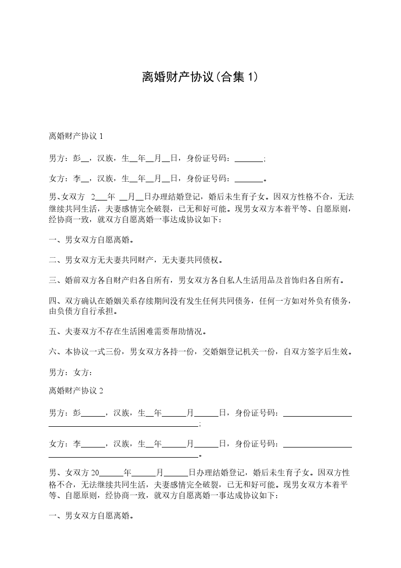 无财产离婚协议书男方:彭__,汉族,生__年__月__日,身份证号码:________;