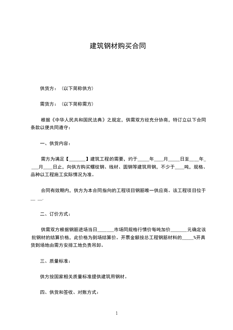 需方为满足【_______】建筑工程的需要,约于_____年____月_____日至____年____月____日止,向供方购买螺纹钢、线材、圆钢等建筑用钢,不少于____吨,规格、品种以工程施工实际情况为准。