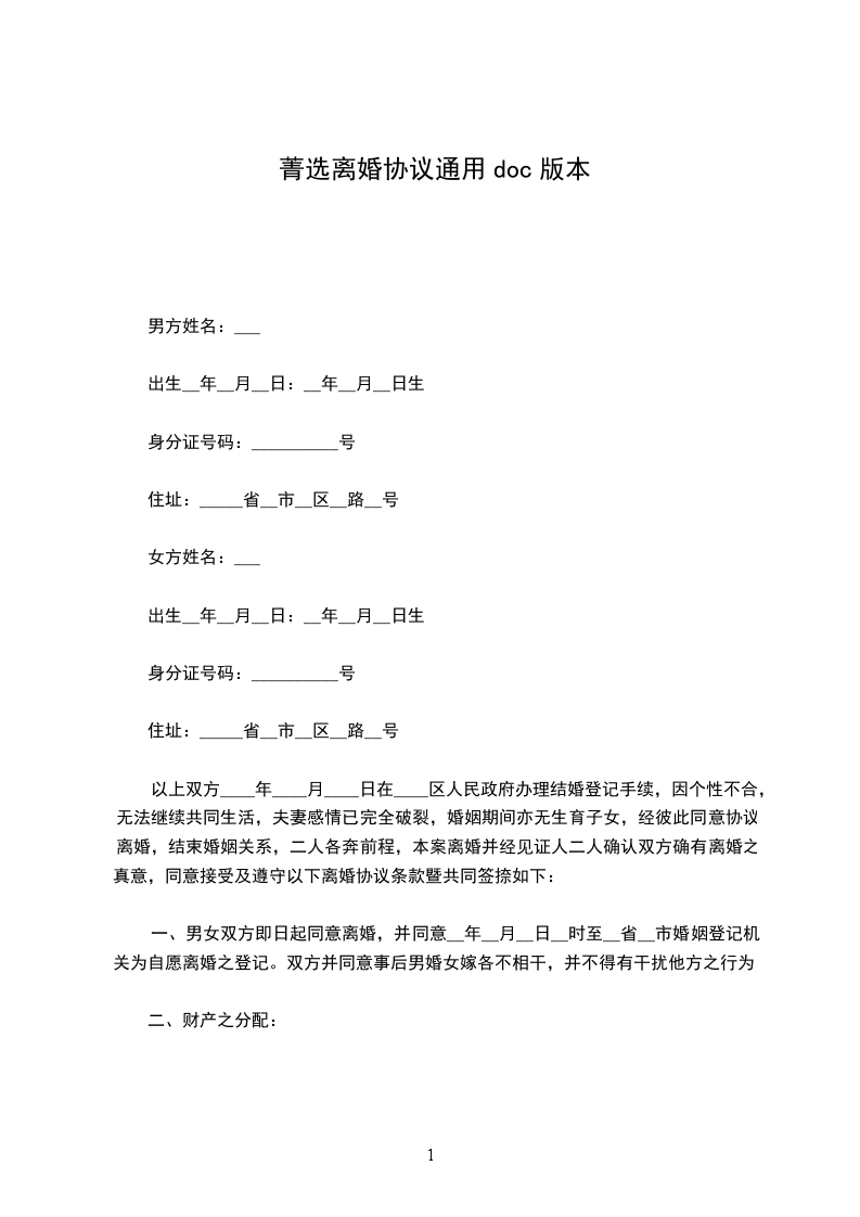 一、男女双方即日起同意离婚,并同意__年__月__日__时至__省__市婚姻登记机关为自愿离婚之登记。双方并同意事后男婚女嫁各不相干,并不得有干扰他方之行为。