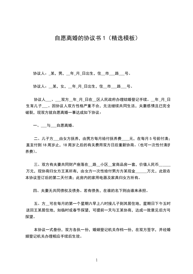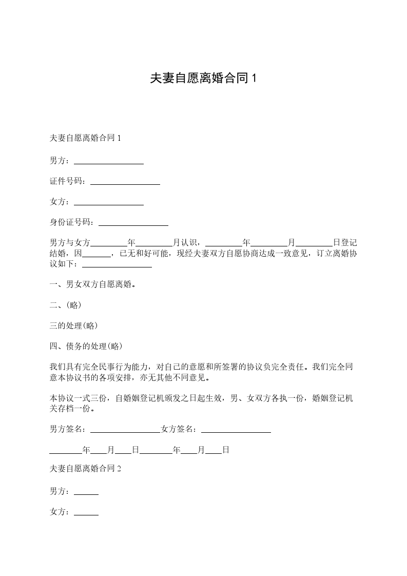 一、__________与__________自愿离婚。