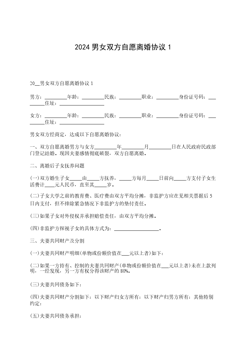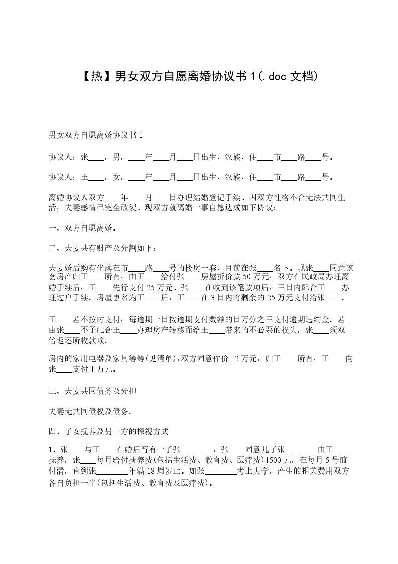 男女双方自愿离婚协议书间____,男,汉族,____年__月__日生,住______,身份证号码:______