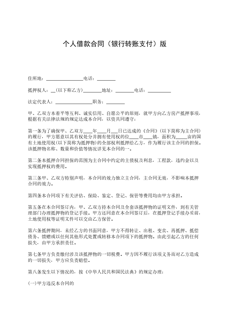 1、借款方用__________________价值元作为借款抵押品。由贷款方保管或公证机关保管。(公证费由借款方负担)。抵押期间,未经甲方书面同意,乙方不得出租、变卖、赠与抵押物,或以其他任何方式处分抵押物。抵押期间抵押物不受乙方资产分割、转让等影响,如甲方发现乙方有违反本条款的情节,将处置抵押物。