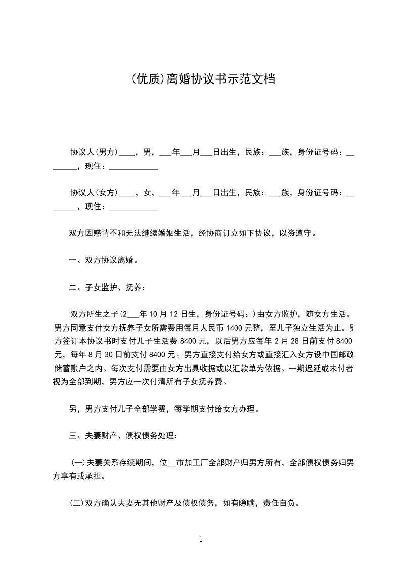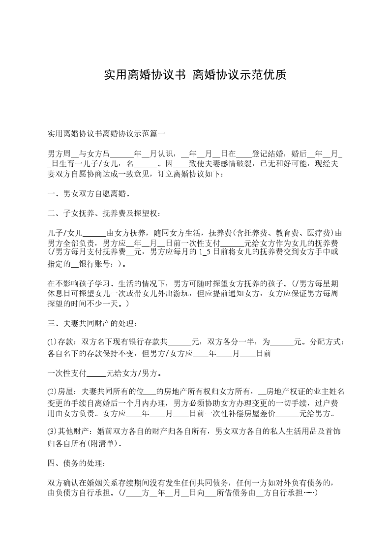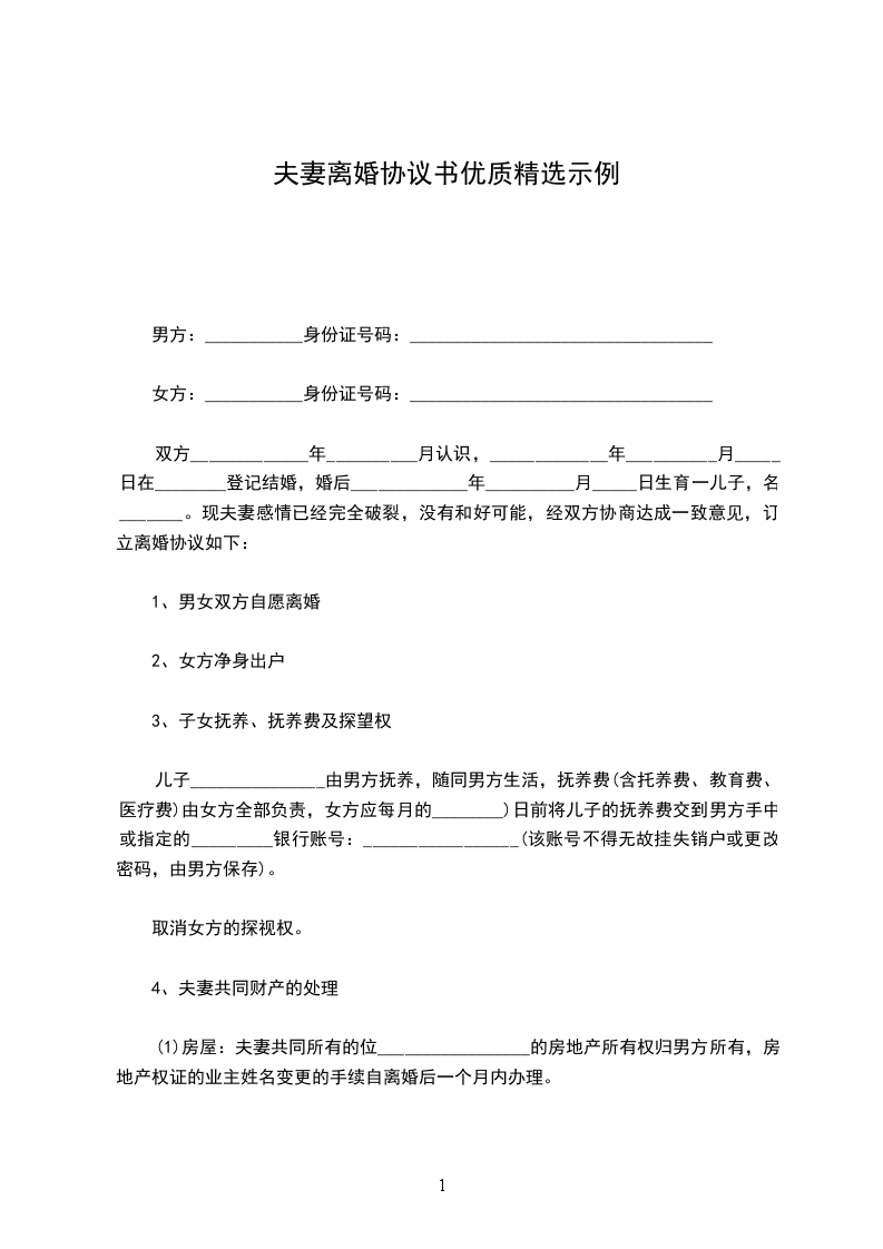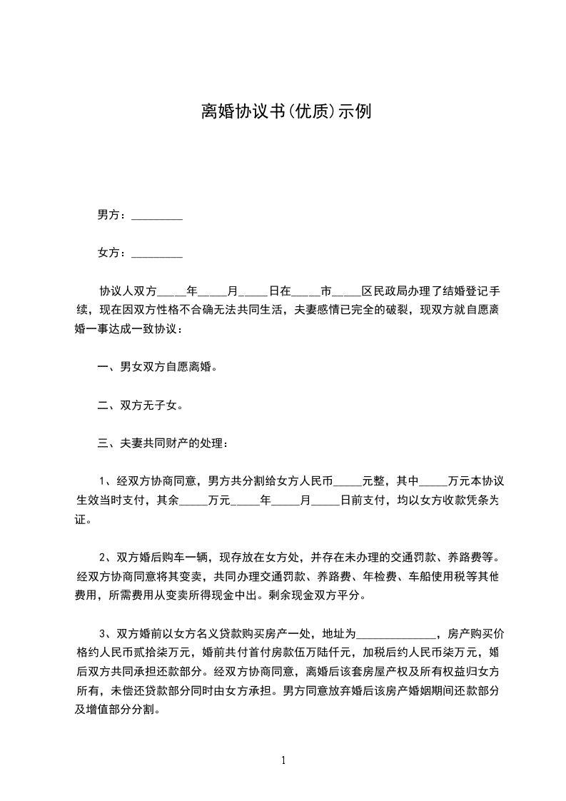 1、经双方协商同意,男方共分割给女方人民币_____元整,其中_____万元本协议生效当时支付,其余_____万元_____年_____月_____日前支付,均以女方收款凭条为证。