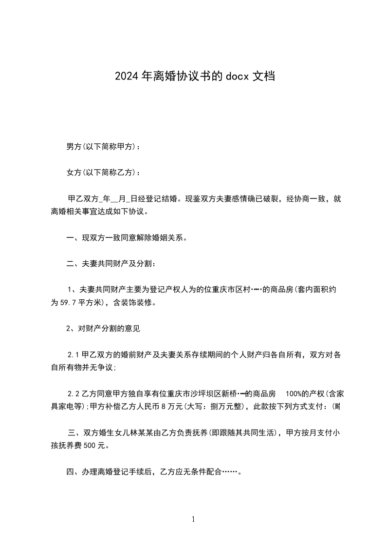 四、夫妻有座落在_路_号的楼房一套(房子具体地址,门牌号,面积写明),价值人民币________万元,现协商归女方所有,房内的家用电器及家具等等(可附清单),归女方所有。