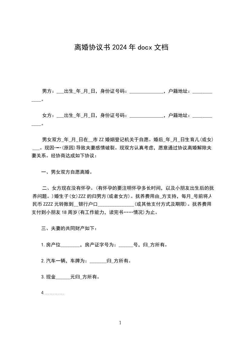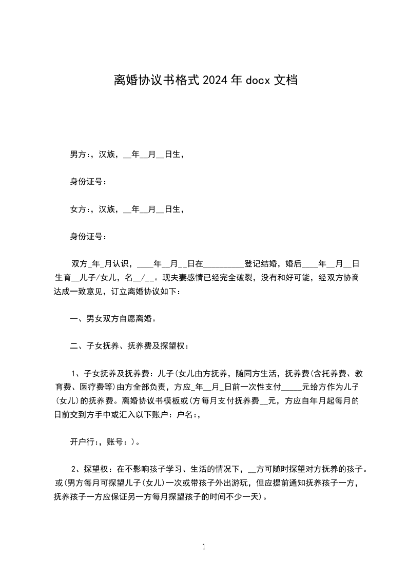 女方:________,________年________月________日出生,民族:_______族,工作单位:_______,现住址:______________。