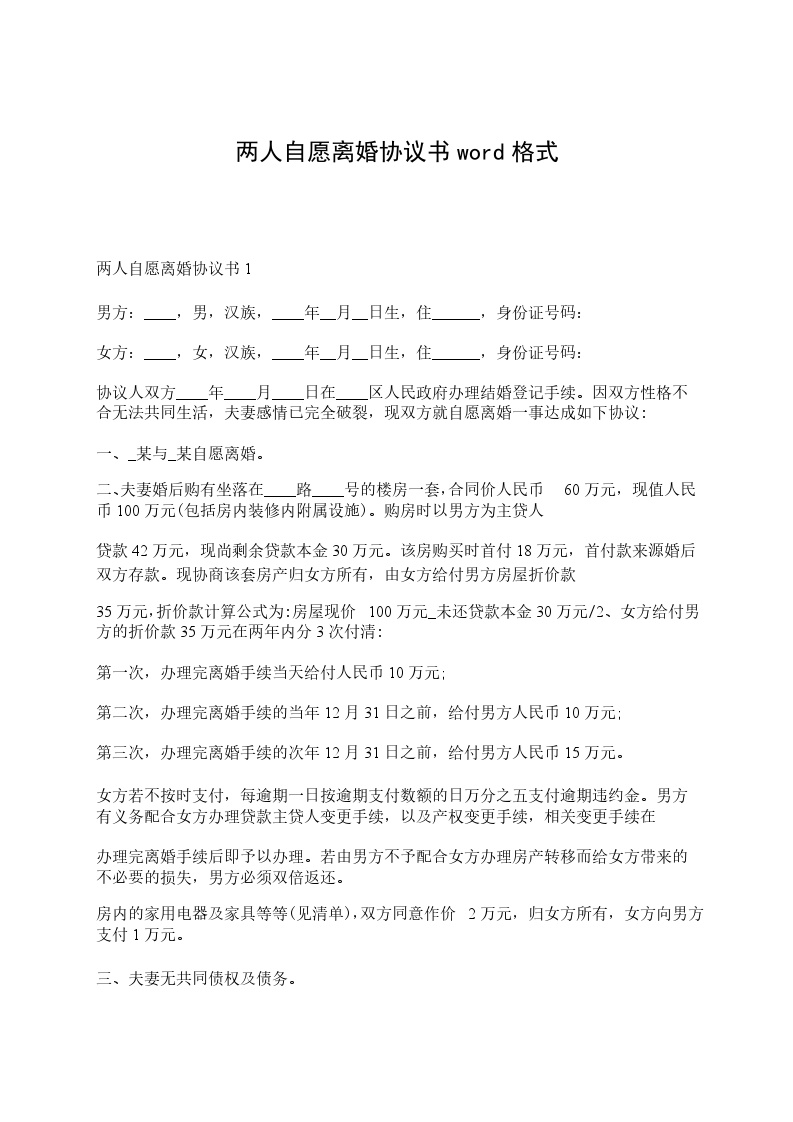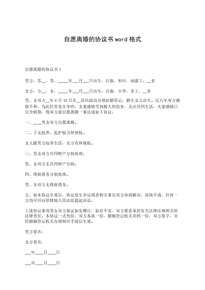 两人自愿离婚协议书3男方:________,男,________出生,现住____________,身份证号码:____________。