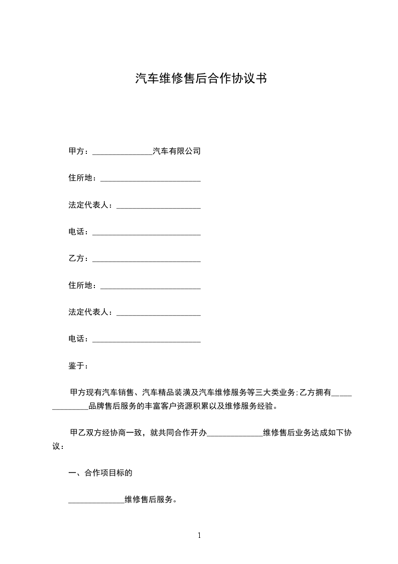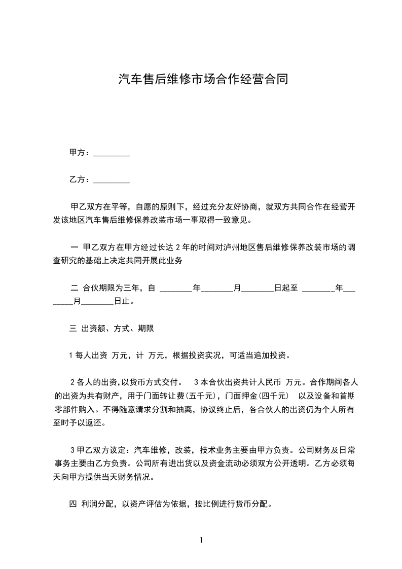 甲乙双方经协商一致,就共同合作开办______________维修售后业务达成如下协议: