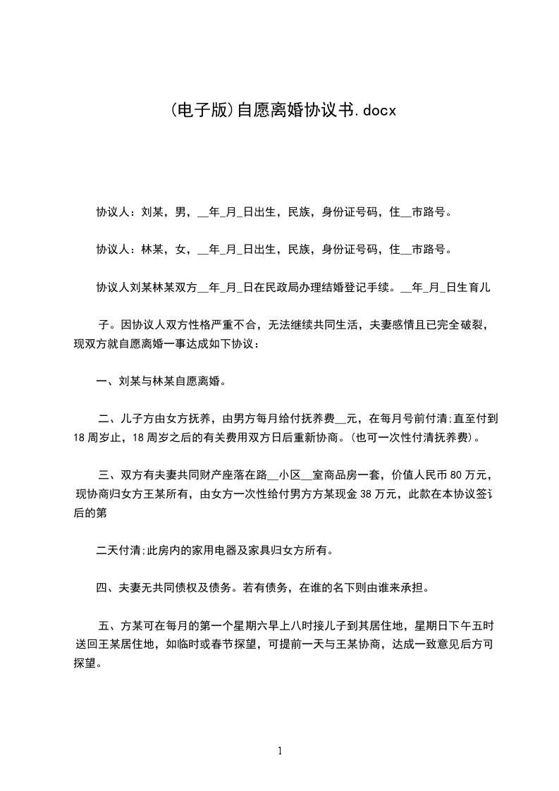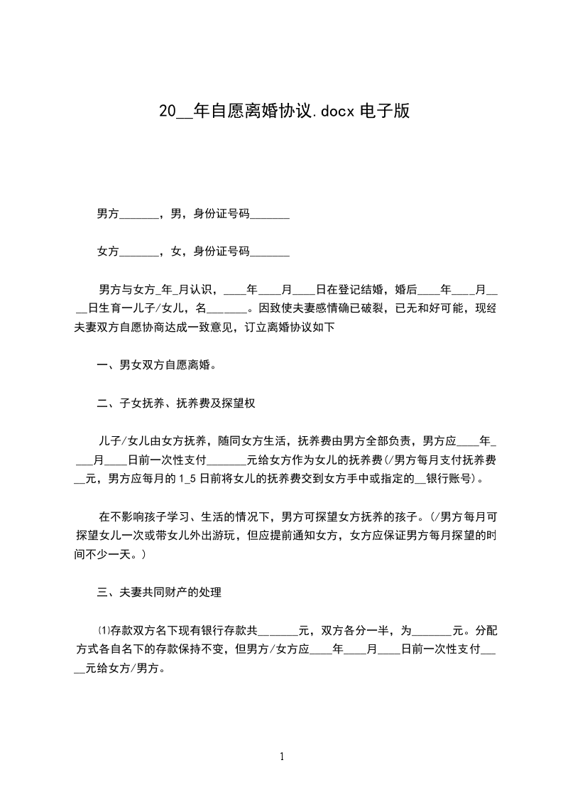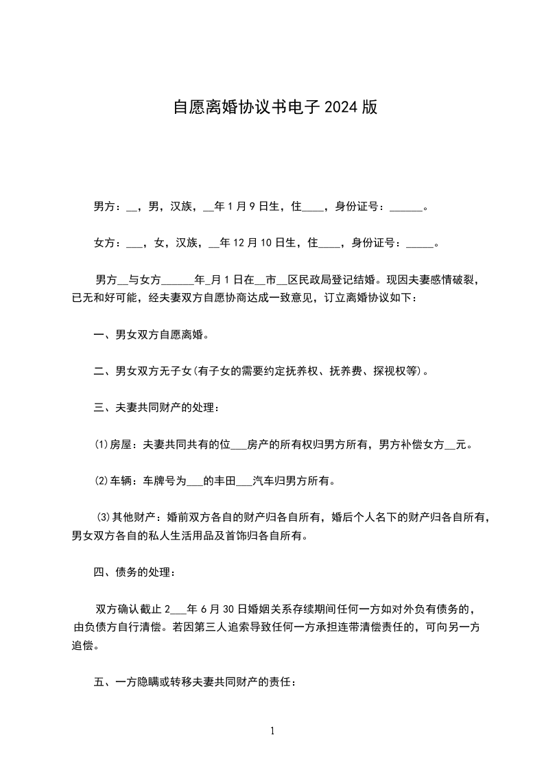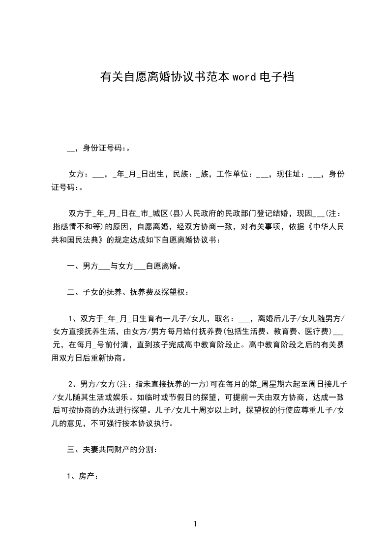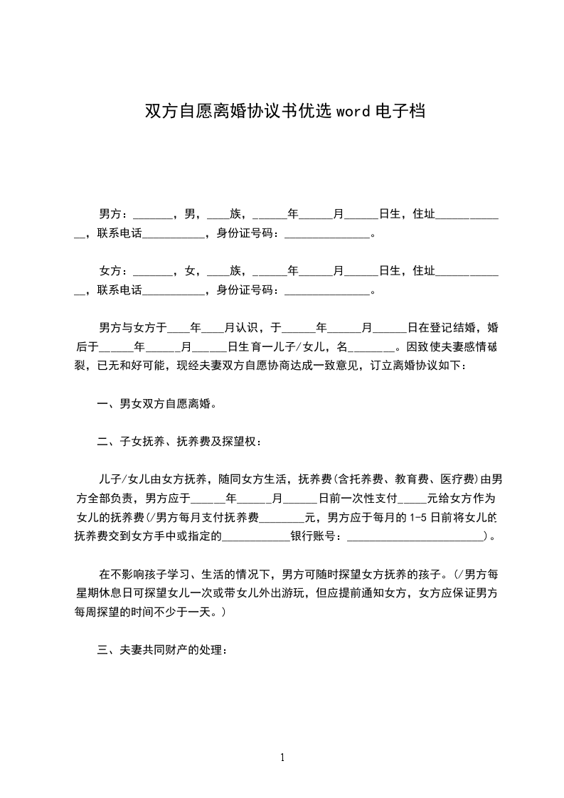 女方:男方______与女方______现因夫妻感情彻底破裂自愿离婚,经双方商定,对有关事项达成以下协议: