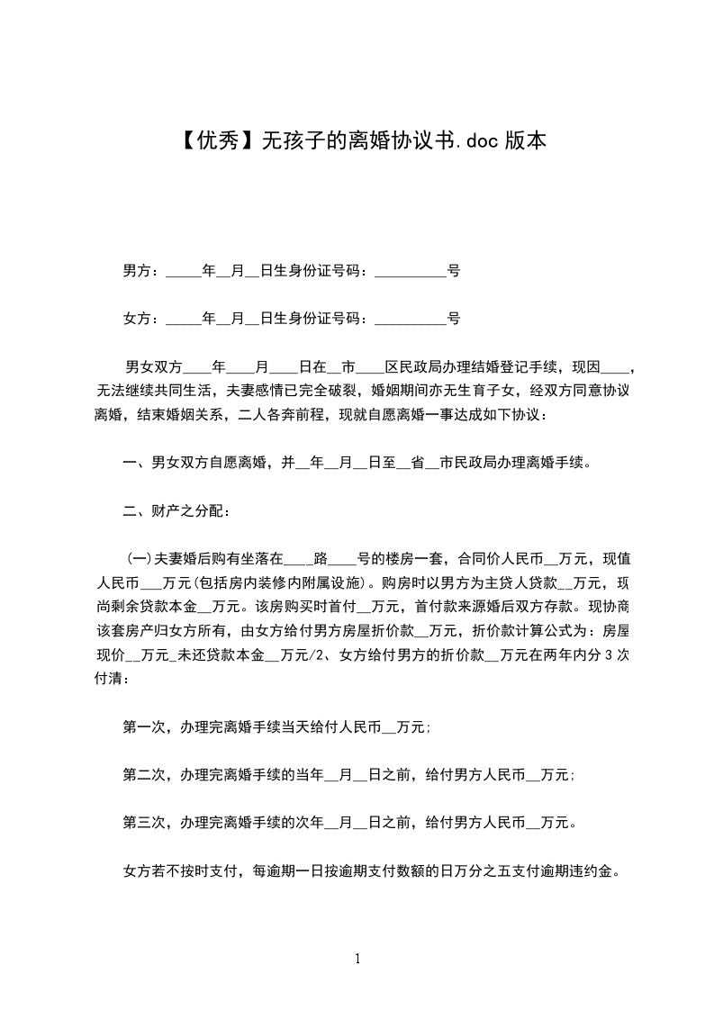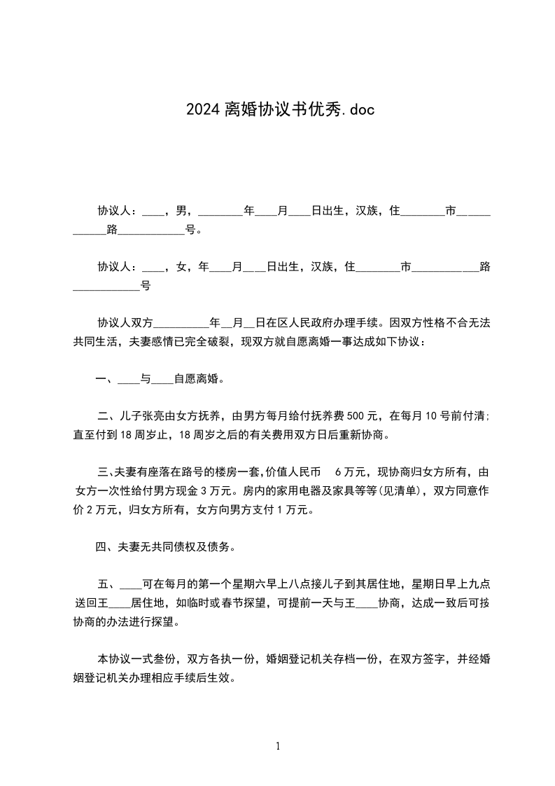 离婚协议人:___,女,____年____月____日出生,汉族,住____市____路____号。