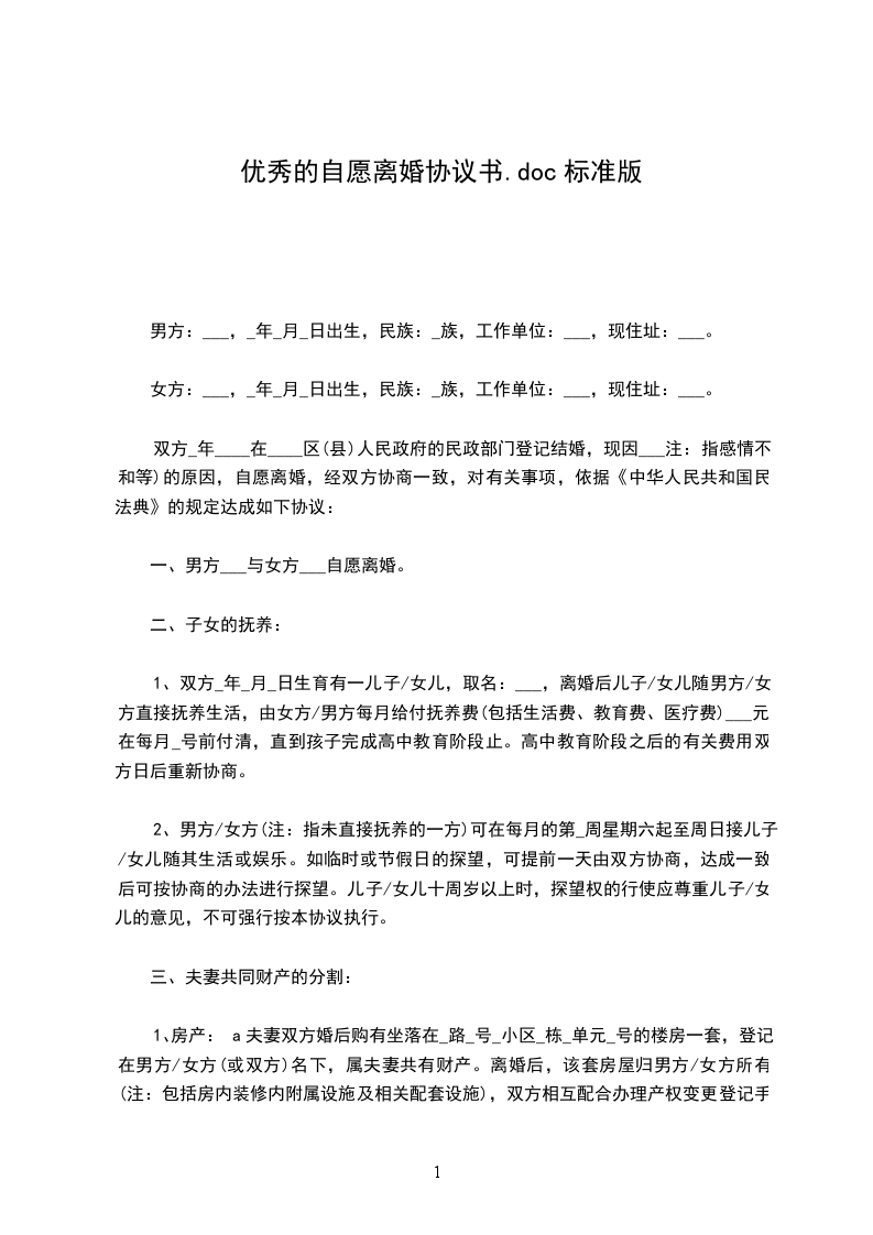 一、___与___自愿离婚。