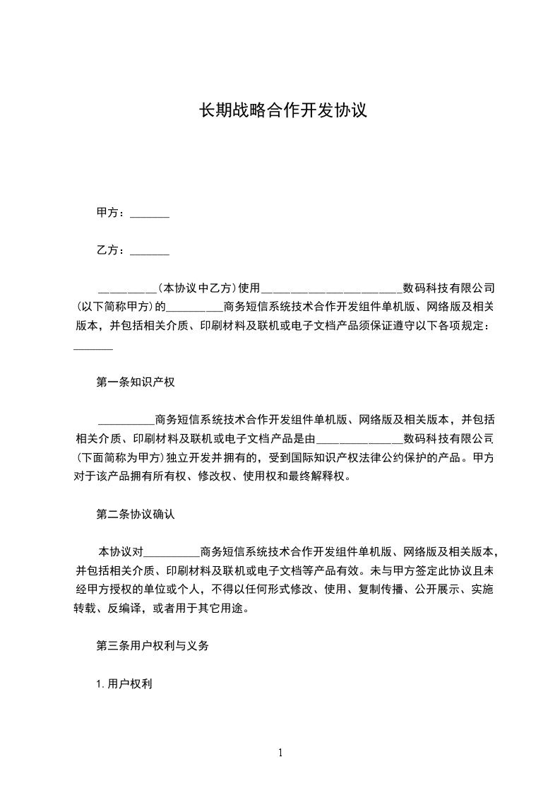 甲乙双方基于良好的信任,处于双方长远发展战略上的考虑,甲乙双方决定共同携手,就__________等领域开展合作,结成深度的战略合作伙伴关系。现经双方友好协商,达成以下合作协议: