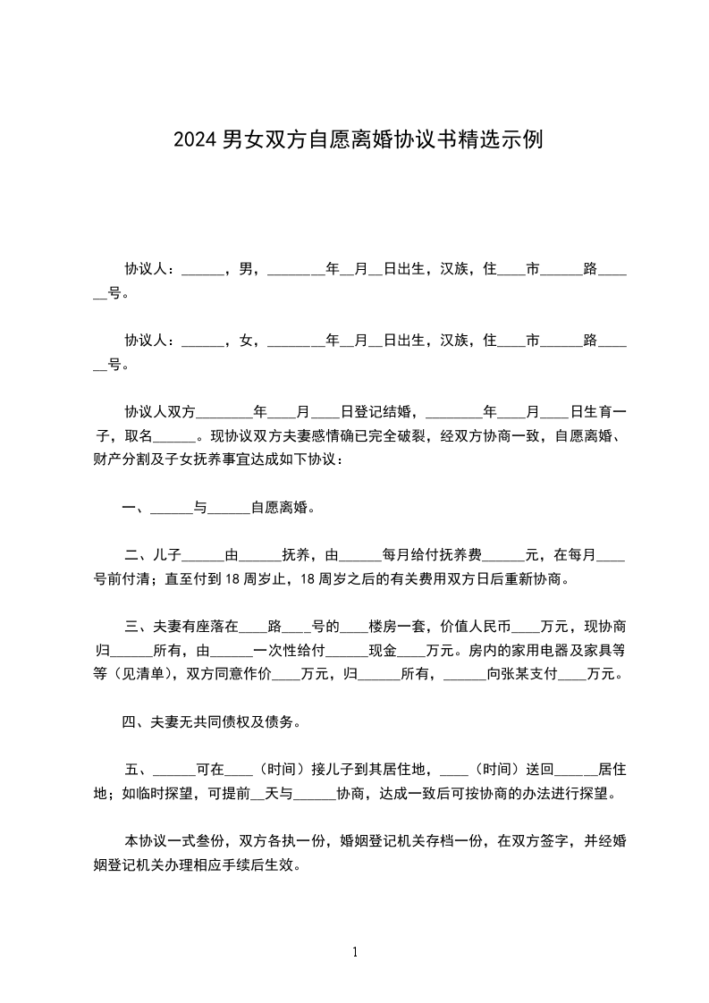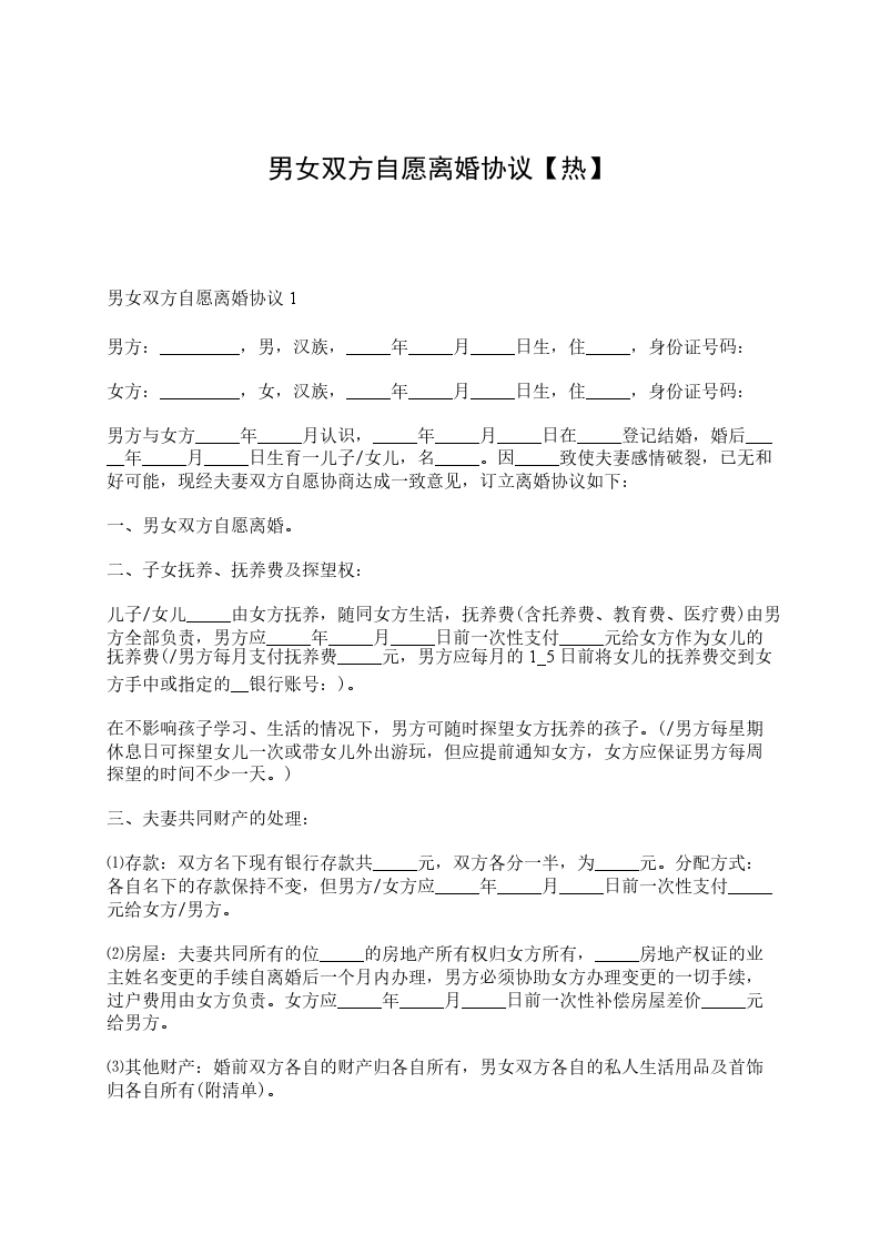 男方____与女方________年__月认识,__年__月__日在____登记结婚,婚后__年__月__日生育一儿子/女儿,名______.因____致使夫妻感情破裂,已无和好可能,现经夫妻双方自愿协商达成一致意见,订立离婚协议如下: