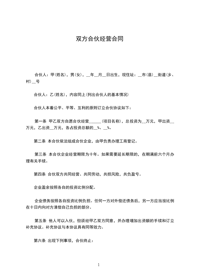第一条 甲乙双方自愿合伙经营______(项目名称),总投资为__万元,甲出资__万元,乙出资__万元,各占投资总额的__%、__%。