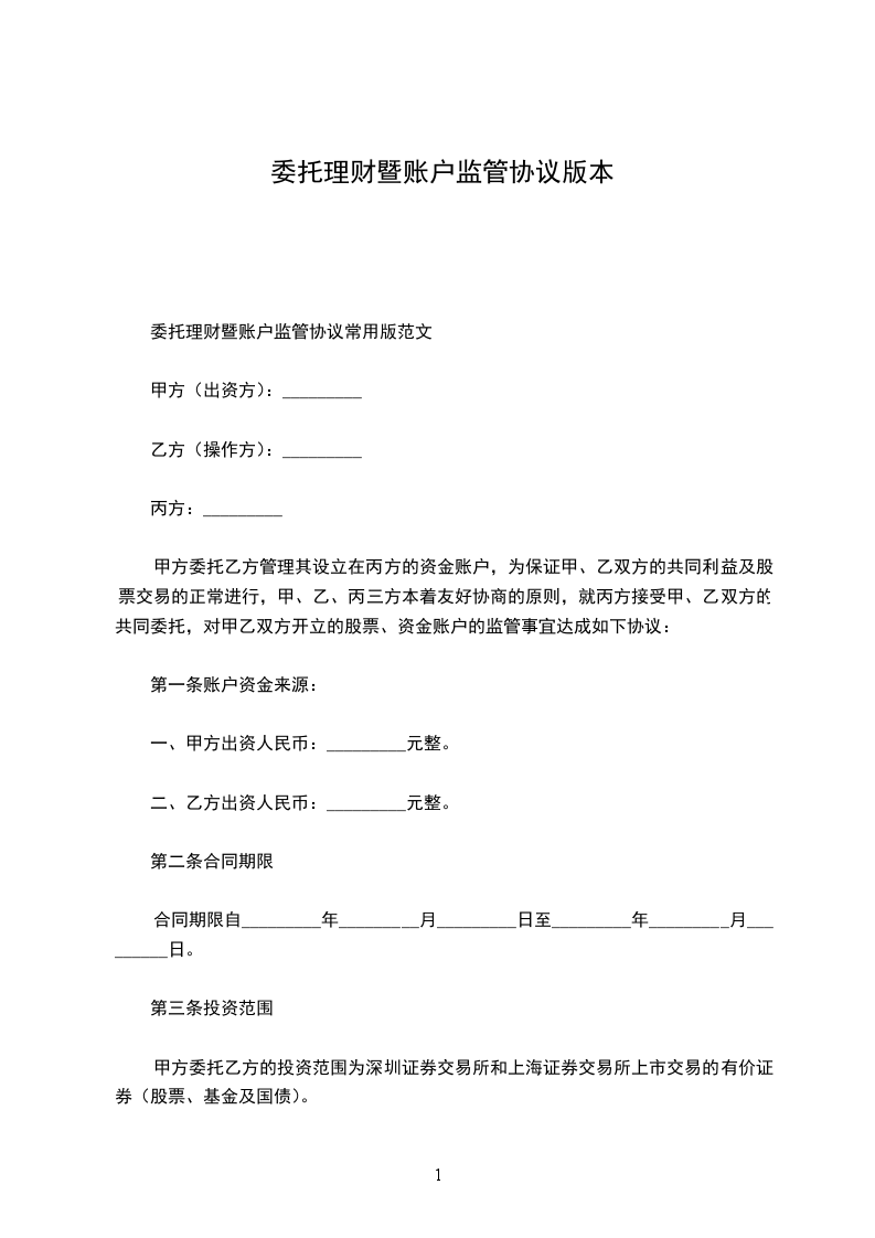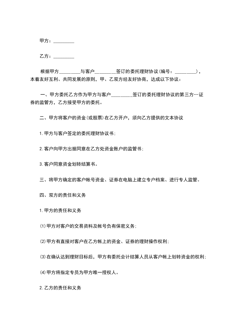 一、甲方委托乙方作为甲方与客户_________签订的委托理财协议的第三方--证券的监管方,乙方接受甲方的委托。