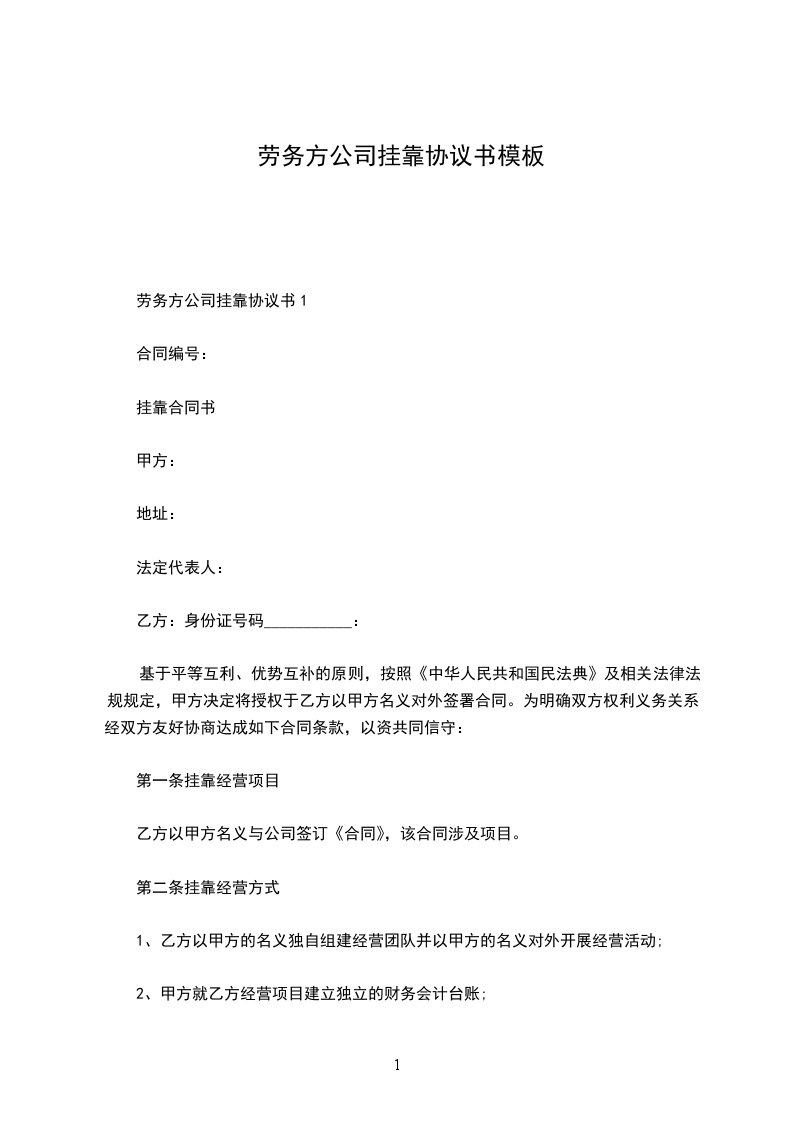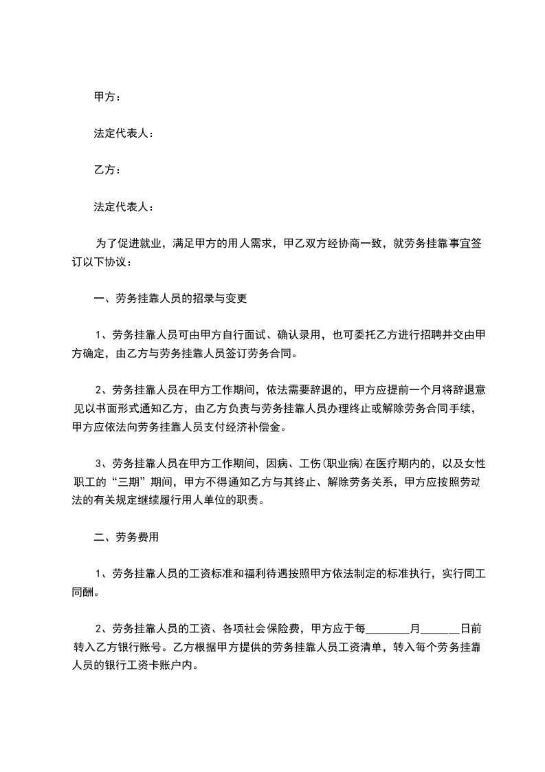为了促进就业,满足甲方的用人需求,甲乙双方经协商一致,就劳务挂靠事宜签订以下协议: