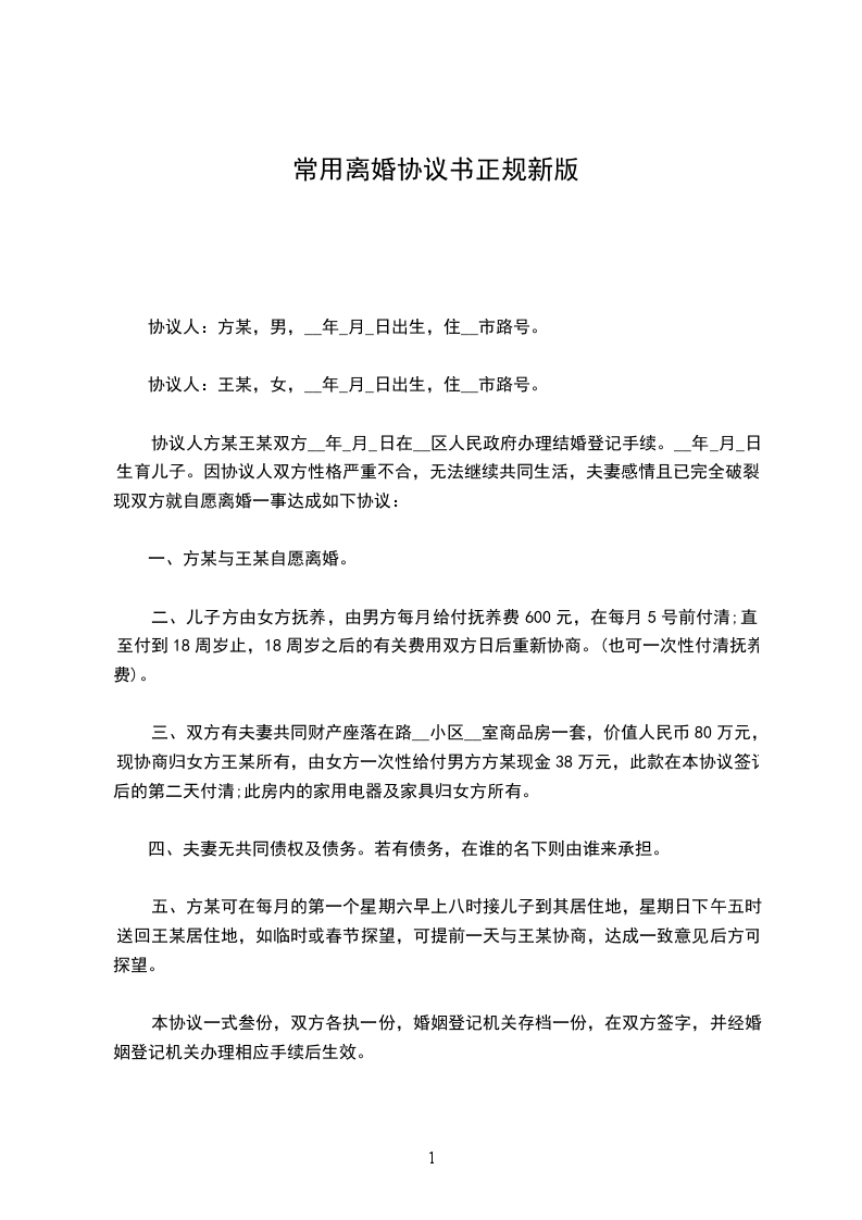 房产1:座落在_______省_______市_______区(县)______________________商品房一套,价值人民币_________万元,现协商归______________所有,此房内的家用电器及家具归______________所有。