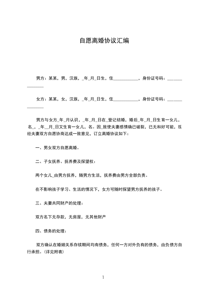 男、女双方_____________年___________月______日办理结婚登记,婚后未生育子女。因双方性格不合,无法继续共同生活,夫妻感情完全破裂,已无和好可能。现男女双方本着平等、自愿原则,经协商一致,就双方自愿离婚一事达成协议如下: