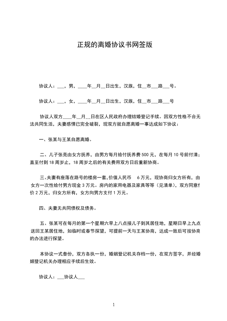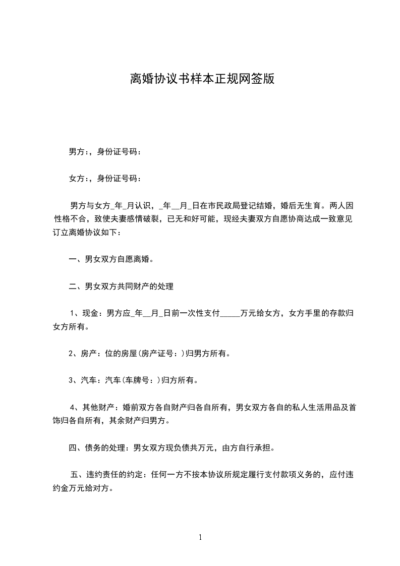男方与女方_年_月认识,____年____月____日在登记结婚,婚后____年____月____日生育一儿子/女儿,名。因致使夫妻感情确已破裂,已无和好可能,现经夫妻双方自愿协商达成一致意见,订立离婚协议如下: