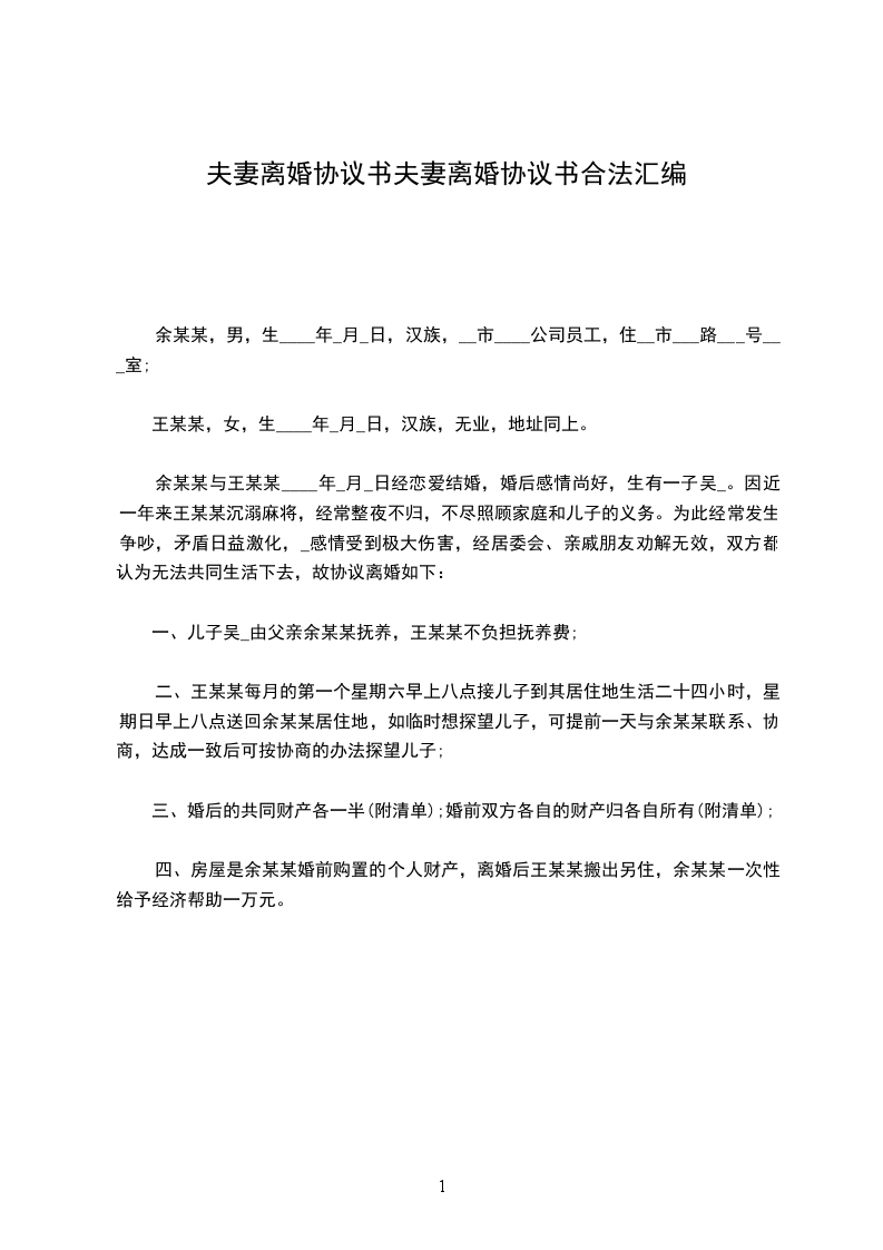 男方与女方_____年____月____日经恋爱结婚,婚后感情尚好,生有一子__________。因近一年来女方沉溺麻将,经常整夜不归,不尽照顾家庭和儿子的义务。为此经常发生争吵,矛盾日益激化,夫妻感情受到极大伤害,经居委会、亲戚朋友劝解无效,双方都认为无法共同生活下去,故协议离婚如下: