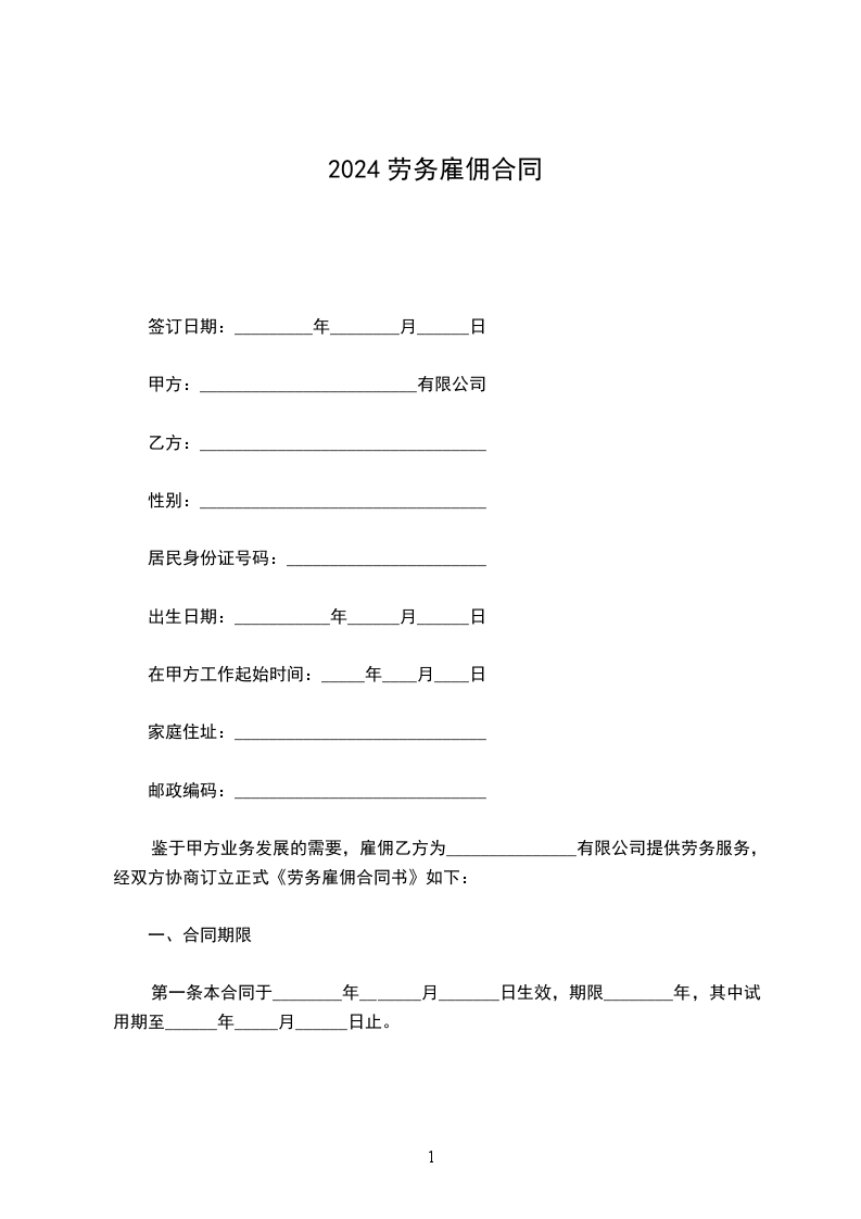 鉴于甲方业务发展的需要,雇佣乙方为_______________有限公司提供劳务服务,经双方协商订立正式《劳务雇佣合同书》如下: