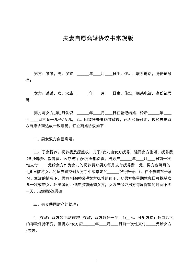 二、子女抚养、抚养费及探望权:儿子/女儿由女方抚养,随同女方生活,抚养费(含托养费、教育费、医疗费)由男方全部负责,男方应______年____月____日前一次性支付_____元给女方作为女儿的抚养费(/男方每月支付抚养费__元,男方应每月的1_5日前将女儿的抚养费交到女方手中或指定的______银行账号:)。在不影响孩子学习、生活的情况下,男方可随时探望女方抚养的孩子。(/男方每星期休息日可探望女儿一次或带女儿外出游玩,但应提前通知女方,女方应保证男方每周探望的时间不少一天。)离婚协议漫画