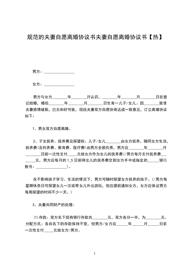 1、存款:双方名下现有银行存款,双方各分一半,为__元。分配方式:各自名下的存款保持不变,但男方/女方应______年____月____日前一次性支付_____元给女方/男方。