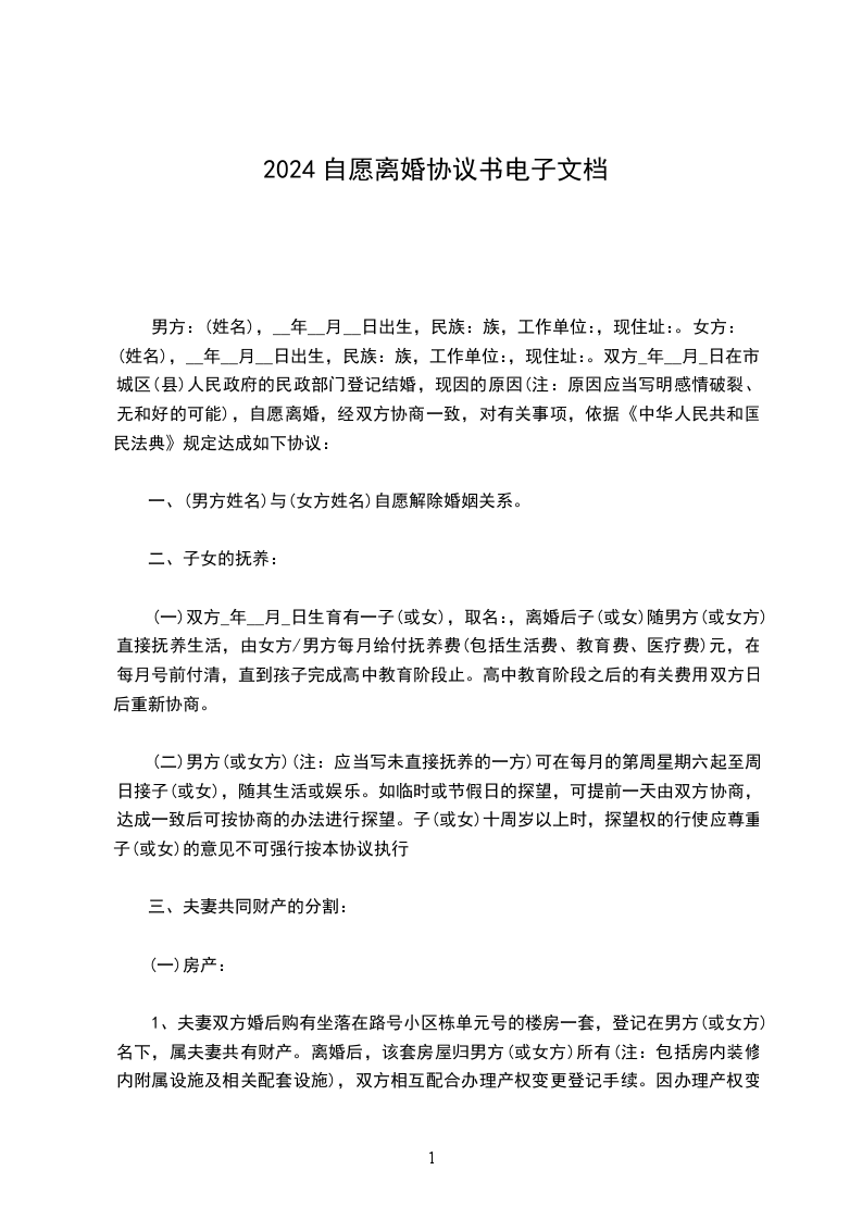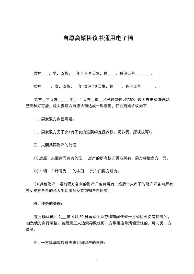 一、男方_________与女方_________自愿离婚。