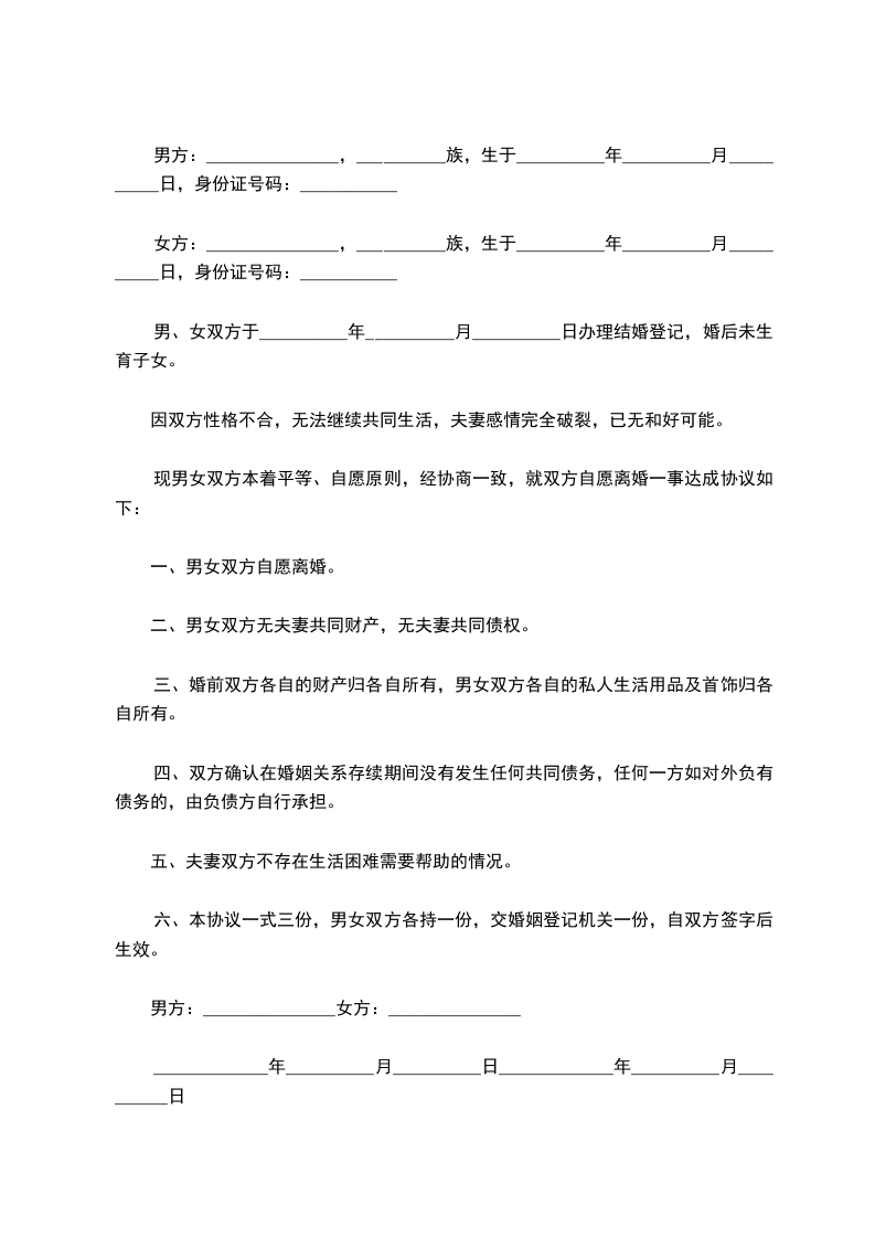 男方与女方_年_月认识,_年__月_日在登记结婚,婚后_年__月_日生育一儿子/女儿,名。因致使夫妻感情破裂,已无和好可能,现经夫妻双方自愿协商达成一致意见,订立离婚协议如下: