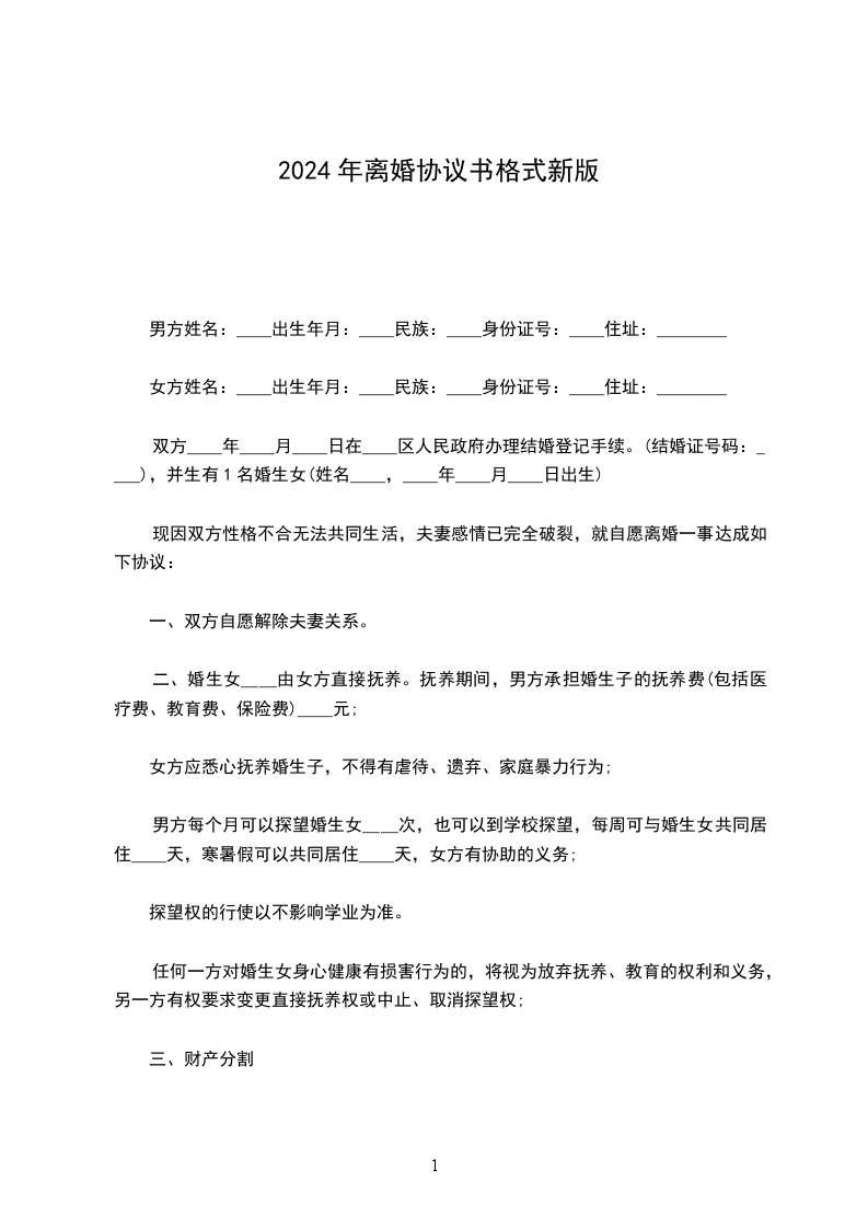 男女双方___年___月___日在______登记结婚,婚后___年___月___日生育女儿,名______。因____________,夫妻感情确已破裂,已无和好可能,现经夫妻双方自愿协商达成一致意见,订立离婚协议如下:
