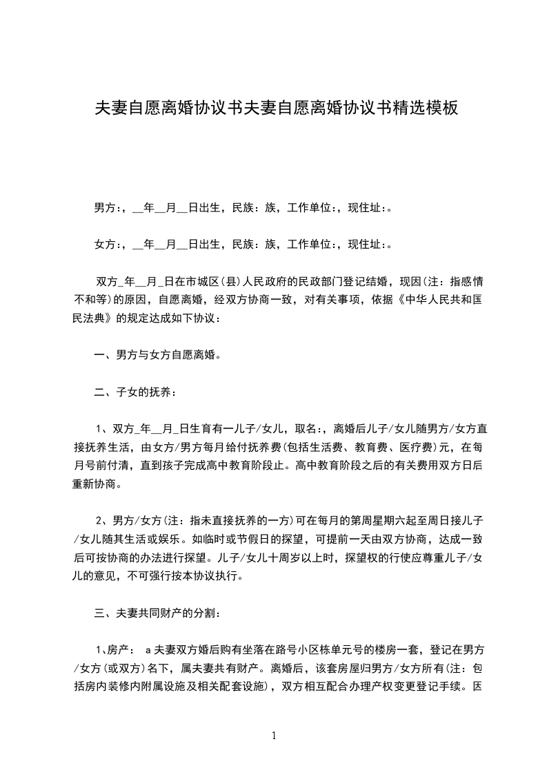 一、男方与女方自愿离婚。