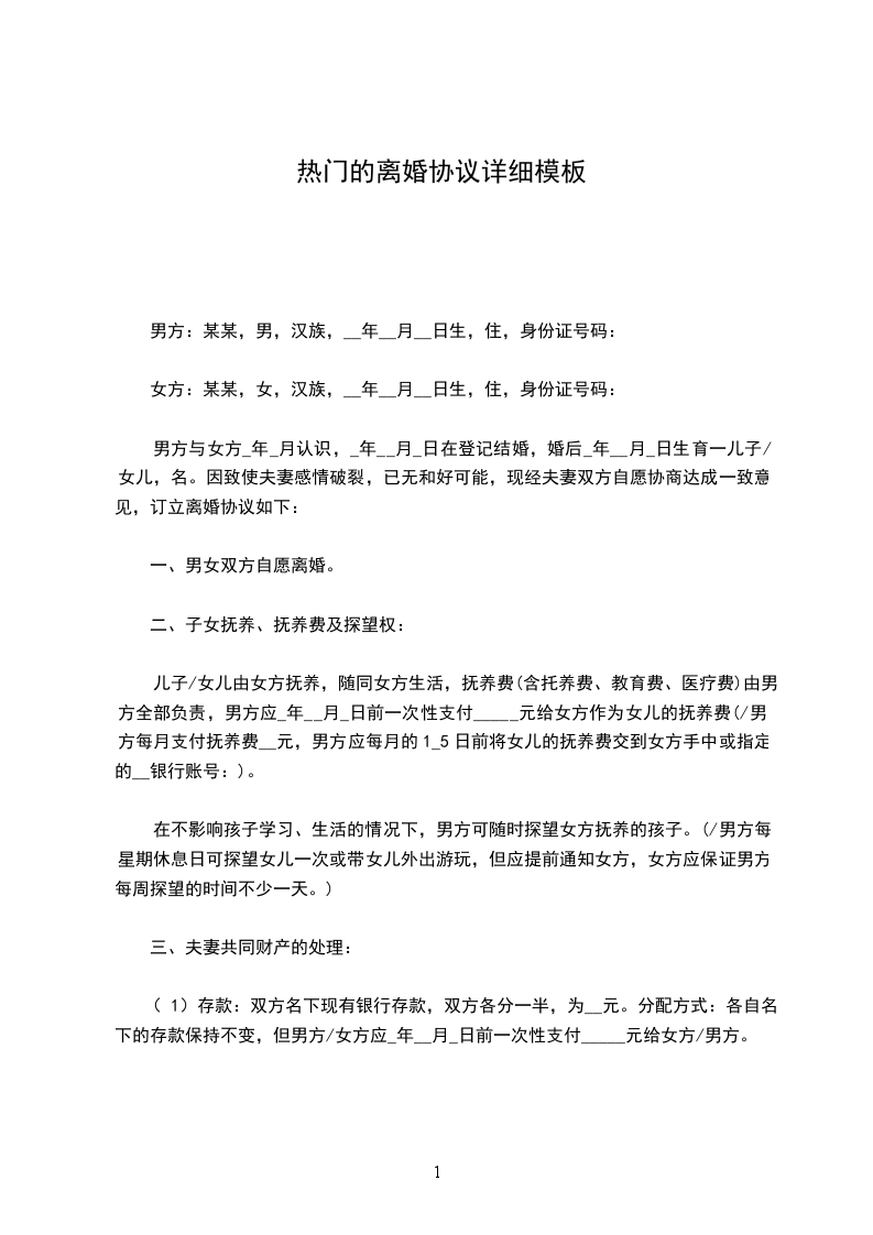 (1)存款:双方名下现有银行存款,双方各分一半,为__元。分配方式:各自名下的存款保持不变,但男方/女方应_年__月_日前一次性支付_____元给女方/男方。