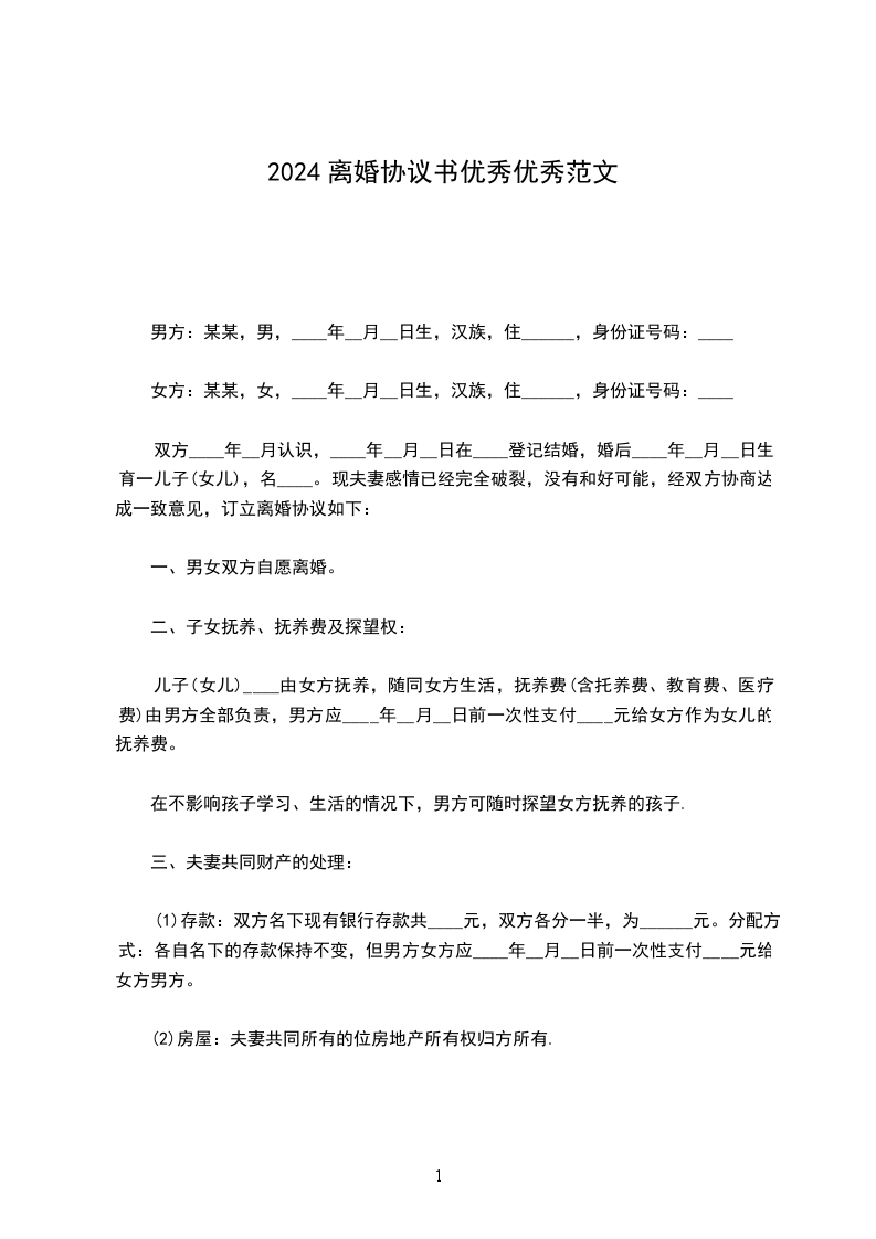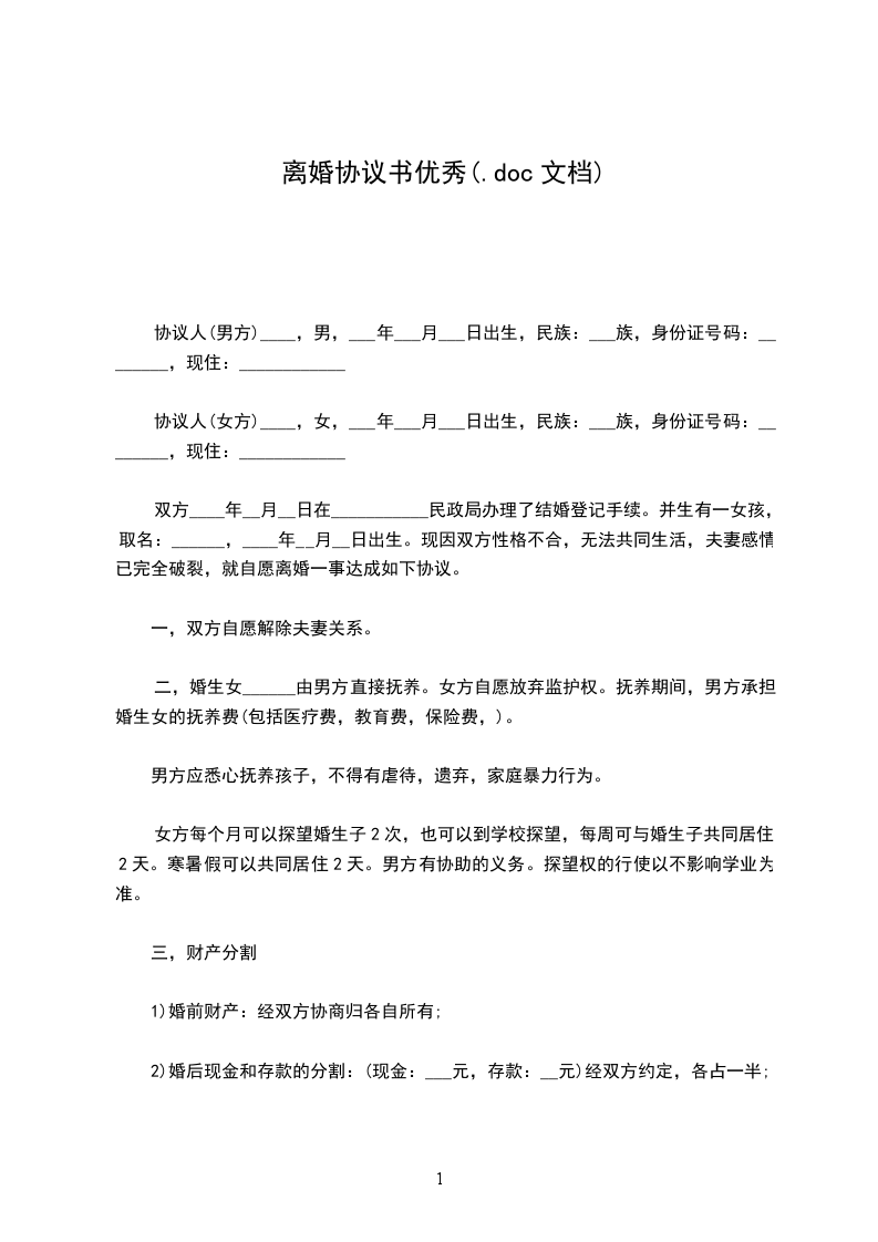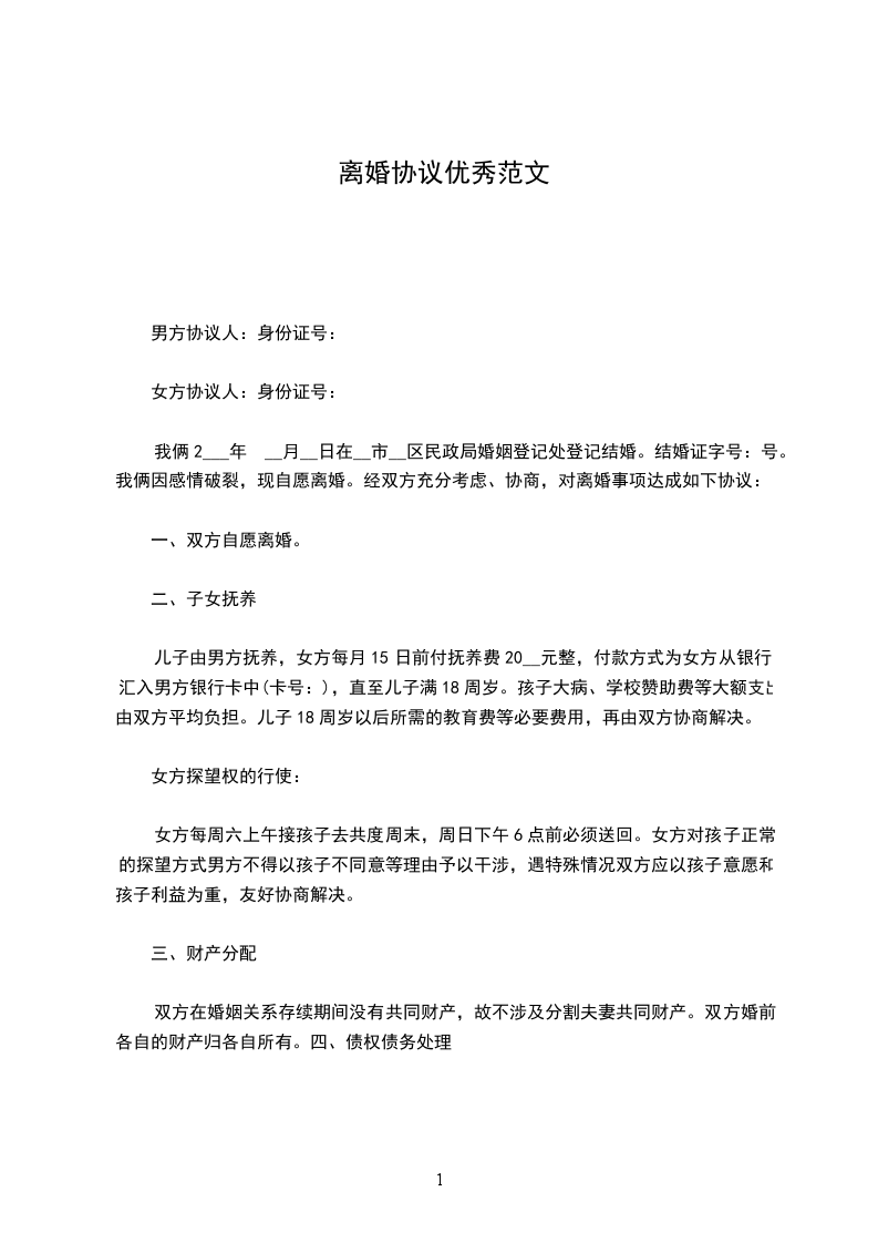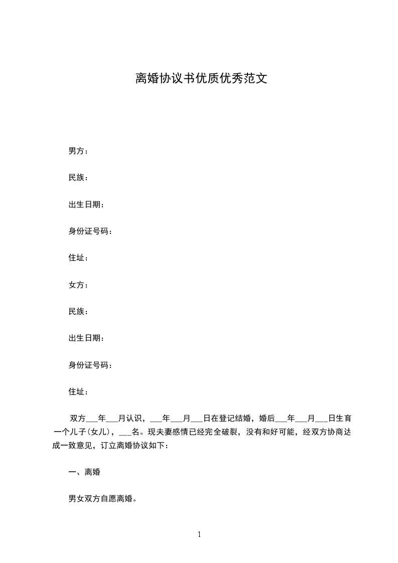 男方与女方_年_月认识,_年__月_日在登记结婚,婚后_年__月_日生育一儿子/女儿,名。因致使夫妻感情确已破裂,已无和好可能,现经夫妻双方自愿协商达成一致意见,订立离婚协议如下: