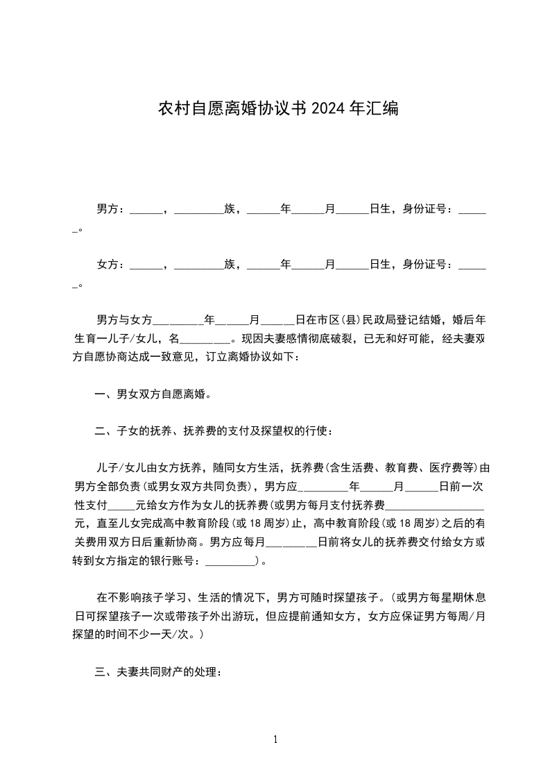 2.本协议一式_________份,男、女双方各执_________份,婚姻登记机关存档_________份,自双方签字,并经婚姻登记机关颁发《离婚证》之日起生效。