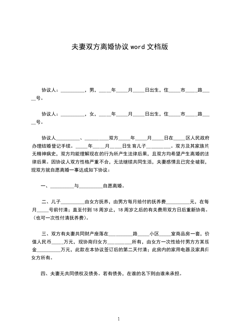 双方____年__月认识,____年__月__日在____登记结婚,婚后____年__月__日生育一儿子(女儿),名____。现夫妻感情已经完全破裂,没有和好可能,经双方协商达成一致意见,订立离婚协议如下:
