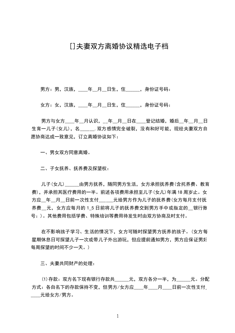 (1)存款:双方名下现有银行存款共____元,双方各分一半,为______元。分配方式:各自名下的存款保持不变,但男方女方应____年__月__日前一次性支付____元给女方男方。