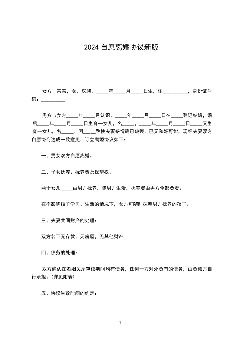 男方与女方_____年_____月认识,_____年_____月_____日在_____登记结婚,婚后_____年_____月_____日生育一女儿,名_____,_____年_____月_____日_____又生育一女儿,名_____。因_____致使夫妻感情确已破裂,已无和好可能,现经夫妻双方自愿协商达成一致意见,订立离婚协议如下: