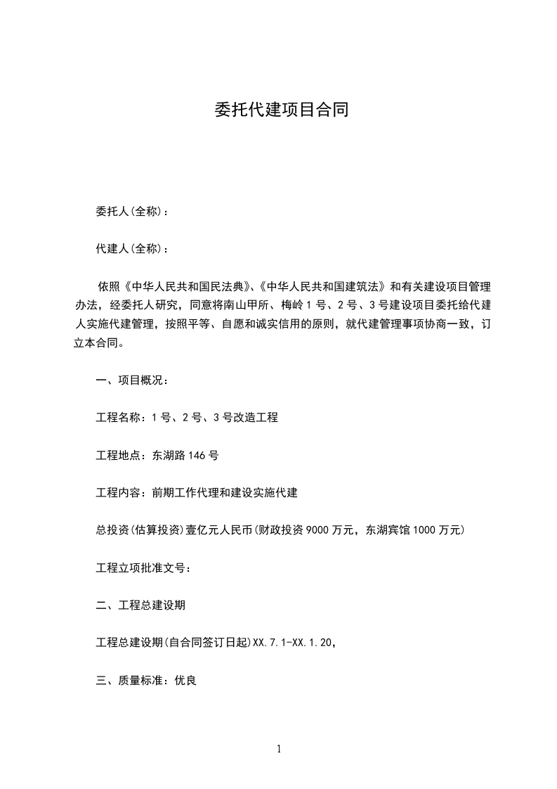 依照《中华人民共和国民法典》、《中华人民共和国建筑法》和有关建设项目管理办法,经委托人研究,同意将南山甲所、梅岭1号、2号、3号建设项目委托给代建人实施代建管理,按照平等、自愿和诚实信用的原则,就代建管理事项协商一致,订立本合同。