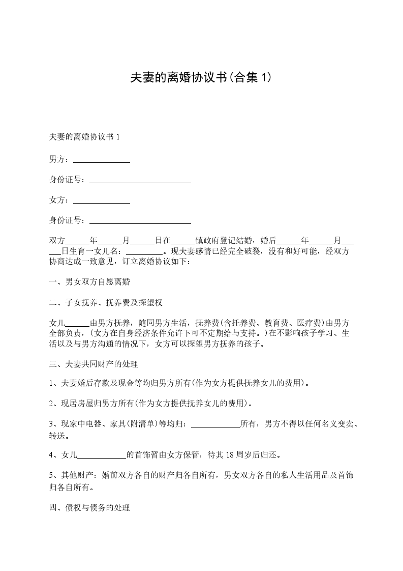 夫妻的离婚协议书4协议人:_______________,男,_____年_____月_____日生,身份证住址:____________,身份证编号:______________