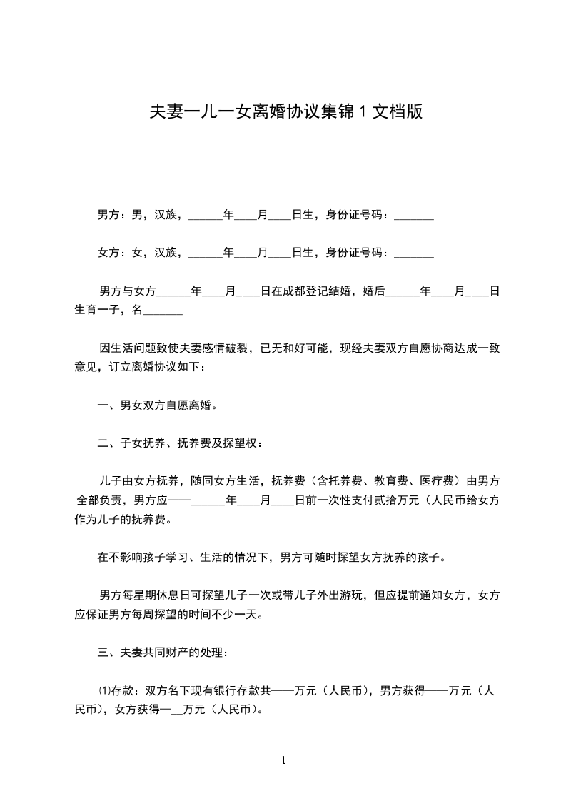 男女双方_________年_________月_________日结婚,_________年_________月生一女(子)_________,现就离婚事宜达成如下协议,供双方遵照执行: