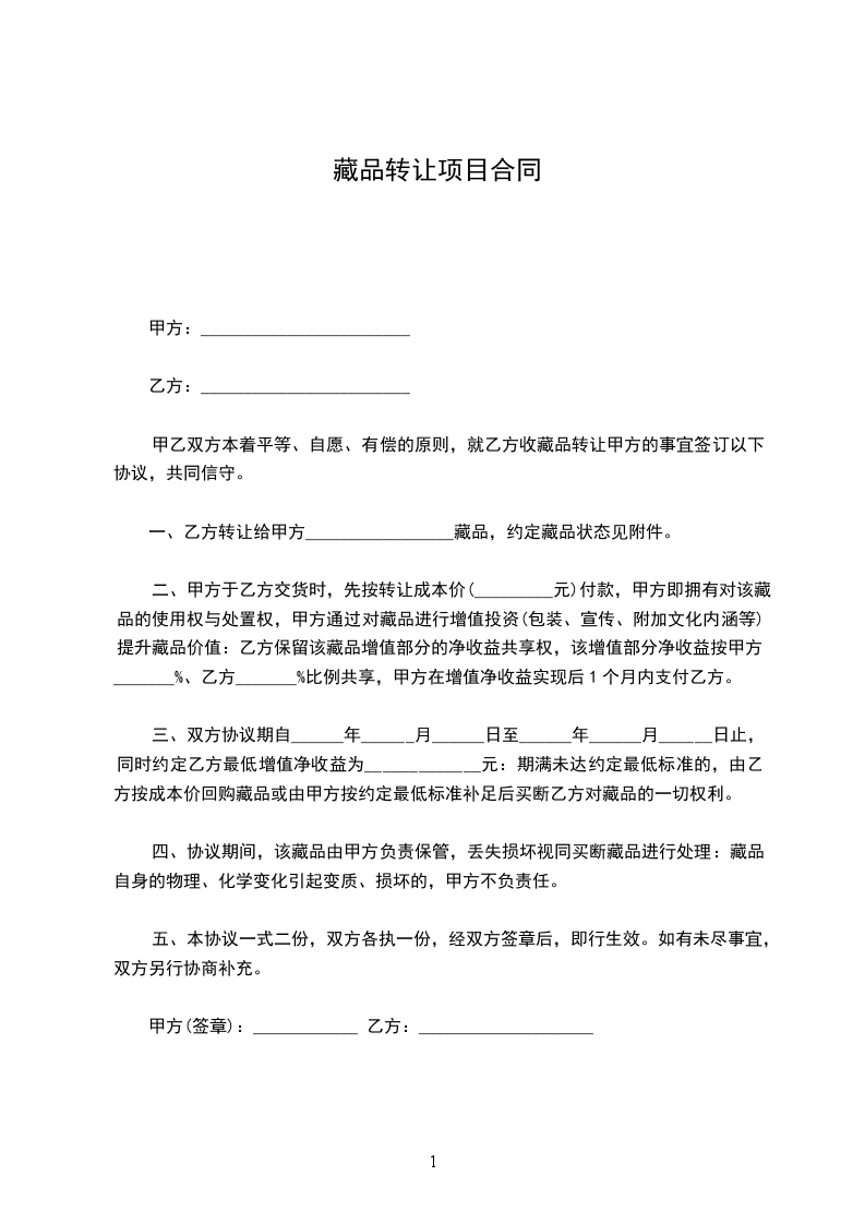 甲乙双方本着平等、自愿、有偿的原则,就乙方收藏品转让甲方的事宜签订以下协议,共同信守。