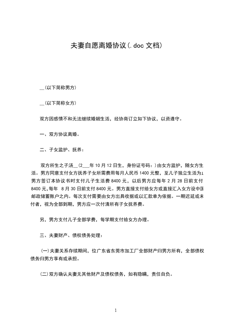 (一)夫妻关系存续期间,位广东省东莞市加工厂全部财产归男方所有,全部债权债务归男方享有或承担。