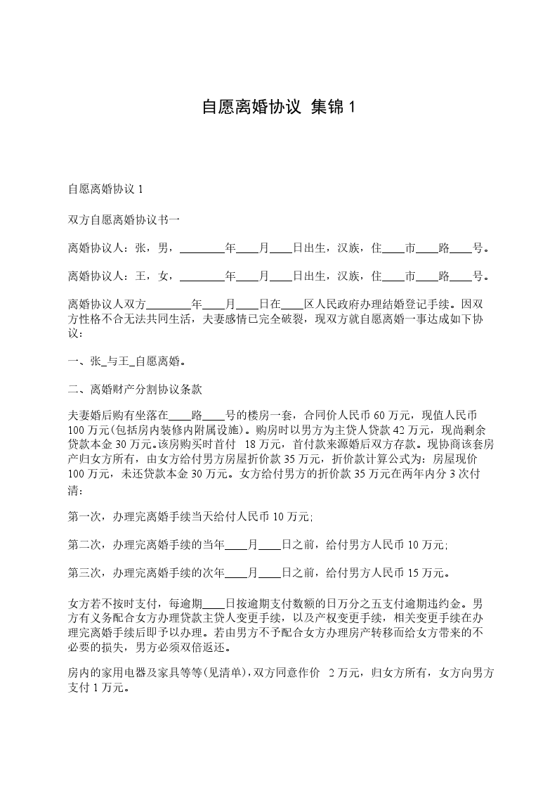 (三)夫妻共同债务如下:(四)夫妻共同财产分割如下:以下财产归女方所有:以下财产归男方所有:其他特别约定:(五)夫妻共同债务承担:四、本自愿离婚协议书一经双方签订即合法成立,经婚姻登记机关登记即具有法律效力。(或:本自愿离婚协议书系在人民法院调解下双方自愿达成的协议,一经双方签字即具有法律效力。)五、上述自愿离婚协议书事项,双方保证切实履行。因子女生活费、教育费、医疗费、对外赔偿等,延迟支付的一方应按日向全部垫付一方支付未支付金额千分之六的延期违约金。子女监护方阻止非监护方探视或不提供探视机会的,非监护方有权取得监护权,有权要求另一方支付精神损失赔偿金,精神损失赔偿金金额为监护方违约行为发生时的上年度全部收入。自愿离婚协议书当事人: